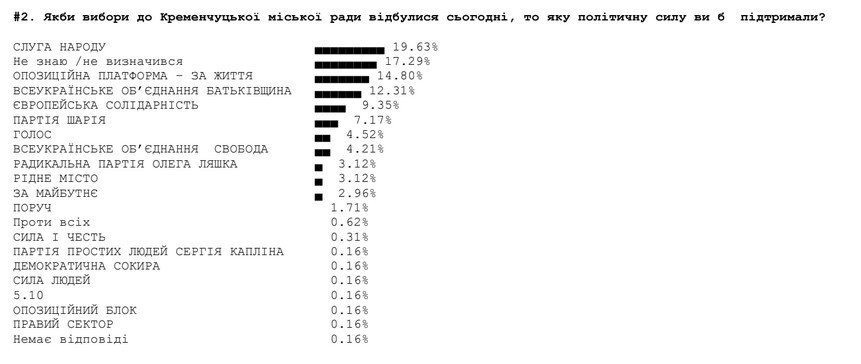 Социологи также задавали кременчужанам такой вопрос: если бы выборы в Кременчугский горсовет состоялись в ближайшее воскресенье, за какую партию вы бы проголосовали?