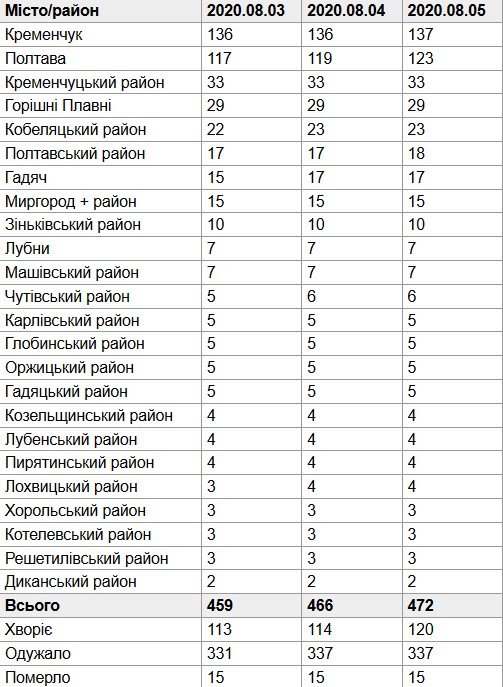 По состоянию на 5 августа, в Полтавской области зарегистрировано уже 472 случая COVID-19. За прошедшие сутки зафиксированы шесть таких случаев – четыре в Полтаве, один в Кременчуге, один в Полтавском районе. Это данные Полтавской облгосадминистрации.