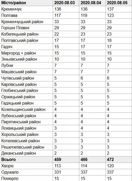 В целом же в Полтавской области стабильно растет количество пациентов с COVID-19. На 22 июля их в области было 360; 30 июля – 431; 5 августа – 472.