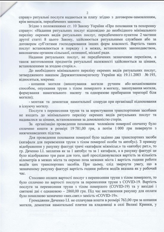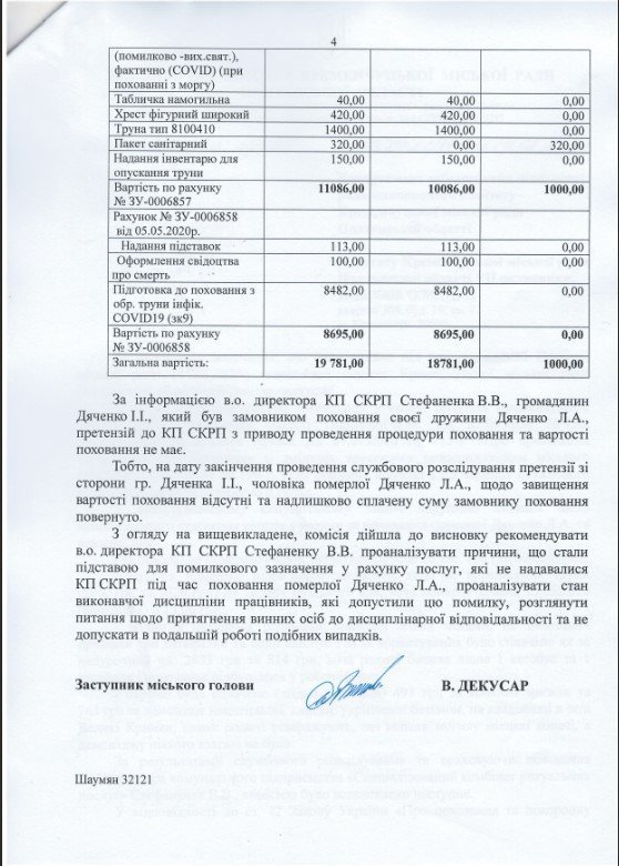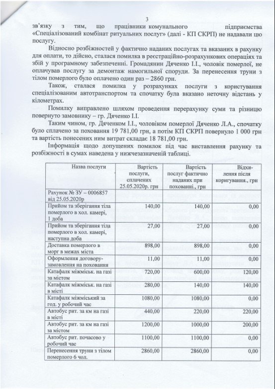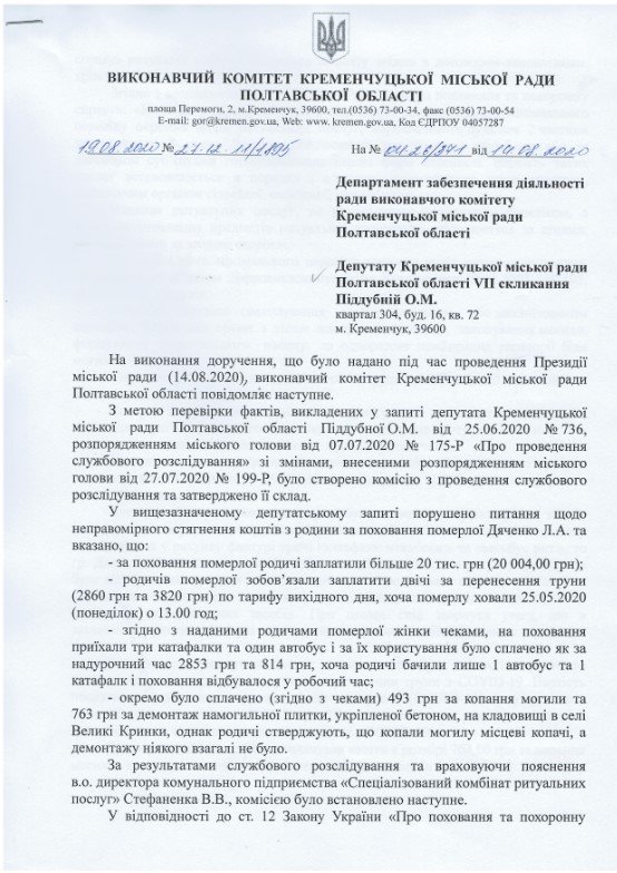 Чиновники провели проверку по делу о скандальном захоронении умершей от COVID-19 Людмилы Дяченко. За похороны кременчугский коммунальный спецкомбинат ритуальных услуг (СКРУ) содрал с её семьи 20 тысяч гривен – в том числе и за услуги, которые не предоставлял. Чиновники мэрии пришли к выводу, что виновен в этом компьютер и сбой в программном обеспечении. Из 20 тысяч семье вернули тысячу. Хотя по версии «Телеграфа», за непредоставленные услуги вернуть должны были 8473 гривны.