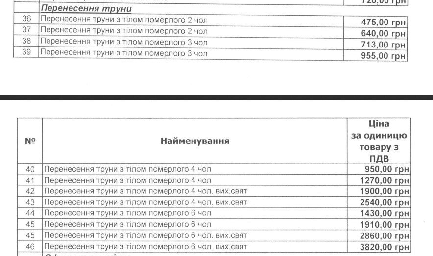 На вопрос «Телеграфа», почему с человека содрали деньги по тарифу выходного дня, хотя хоронили в будний, спецы из исполкома тоже нашли классный ответ – оказывается, с человека взяли деньги не по тарифу выходного дня, а по тарифу за перенос гроба с покойником, умершим от коронавирусной инфекции. И, как вы уже догадались, у кременчугских спецов эти цены оказались одинаковыми. При этом в отчете комиссии не указан документ, которым по состоянию на 25 мая (день похорон) были бы утверждены такие цены. На тот момент действовал прайс СКРУ от 02.05.2020 0н был выложен на сайте исполкома. Вот его фрагмент: