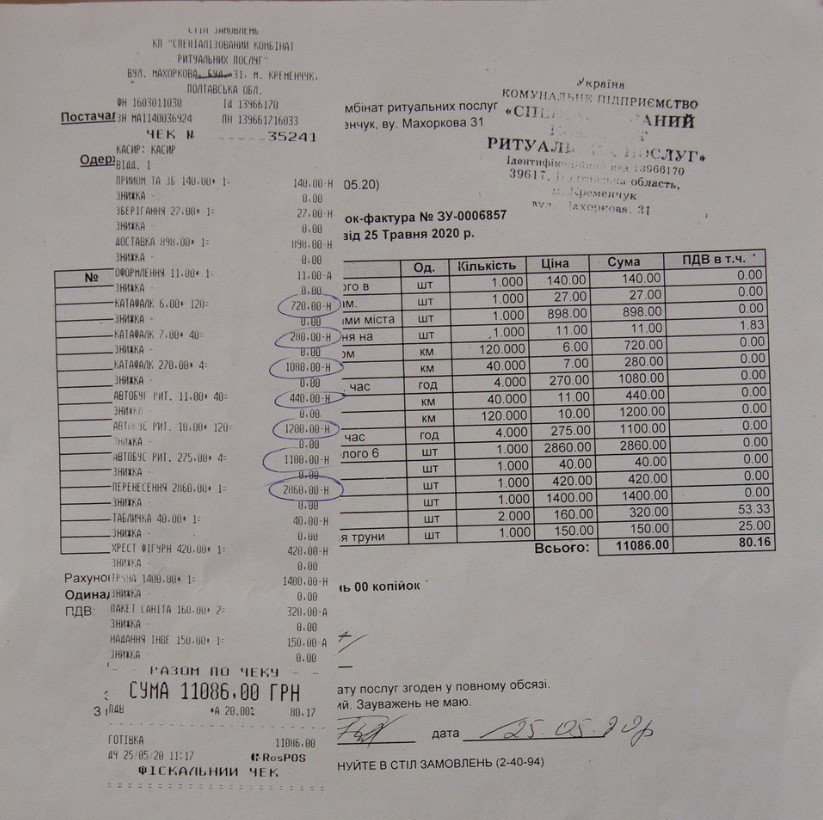 Оказывается, сотрудники СКРУ ещё раз носили гроб туда-сюда – и заказчику пришлось опять заплатить по тарифу выходного дня (3820 грн). Кроме того, по этому чеку он заплатил ещё за два катафалка – 2583 грн и 814 грн Получается, на похороны его жены прибыл почти правительственный кортеж из трех катафалков и автобуса. Также Дяченко заплатил за рытье могилы (493 грн) и демонтаж намогильной плитки (814 грн).