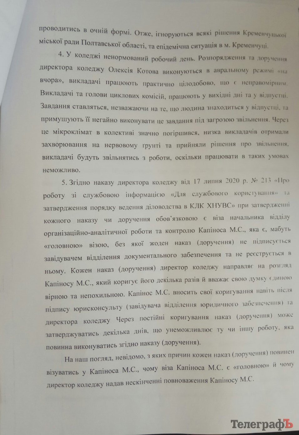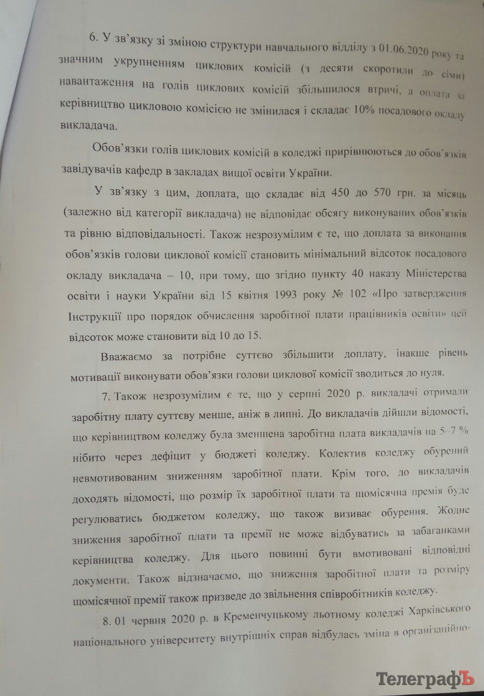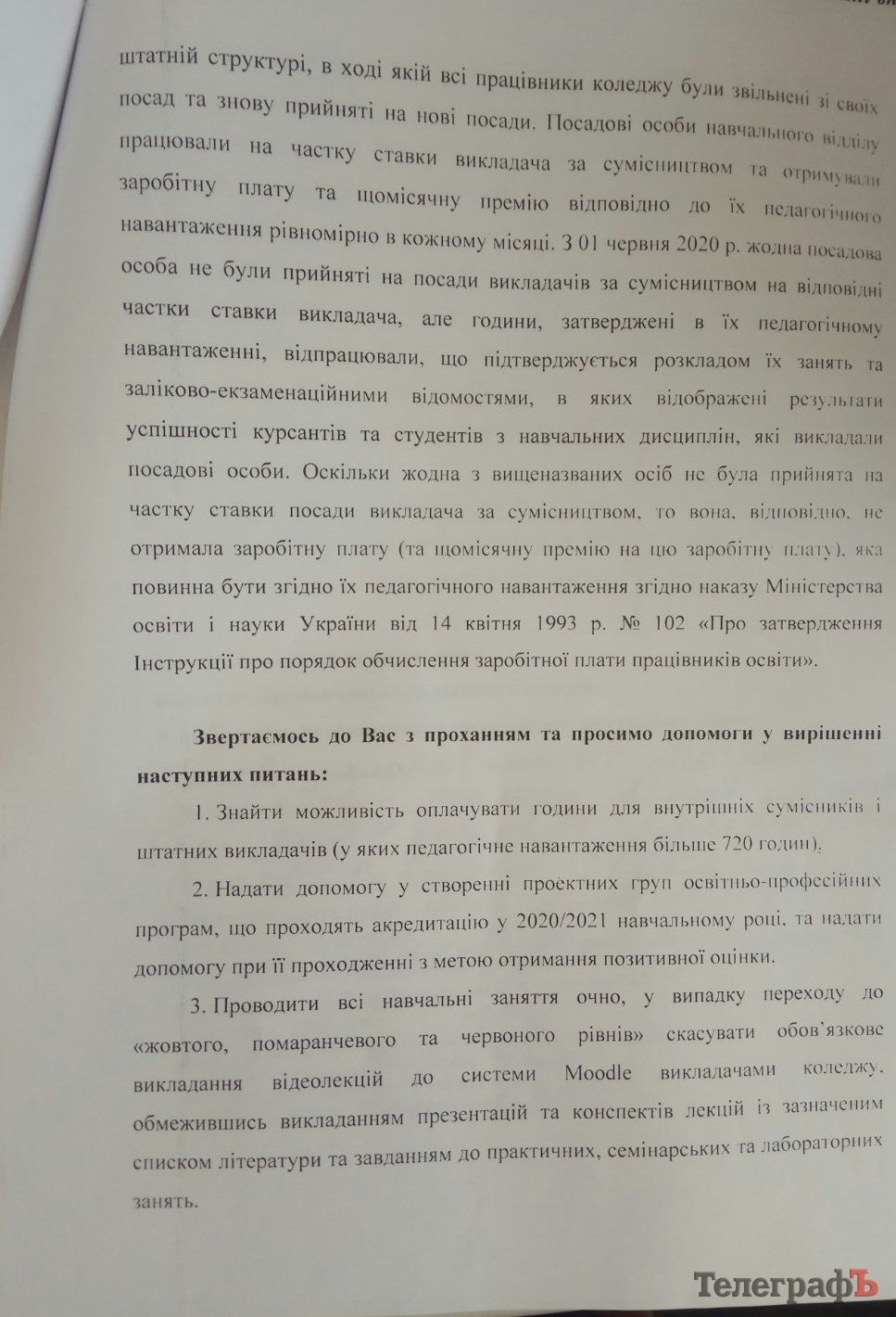 5. У серпні цього року працівники отримали заробітну плату меншу, ніж у липні. Нібито причиною став дефіцит коштів у бюджеті коледжу. Відповідних офіційних документів, які б пояснили таке рішення керівництва, людям не надали.