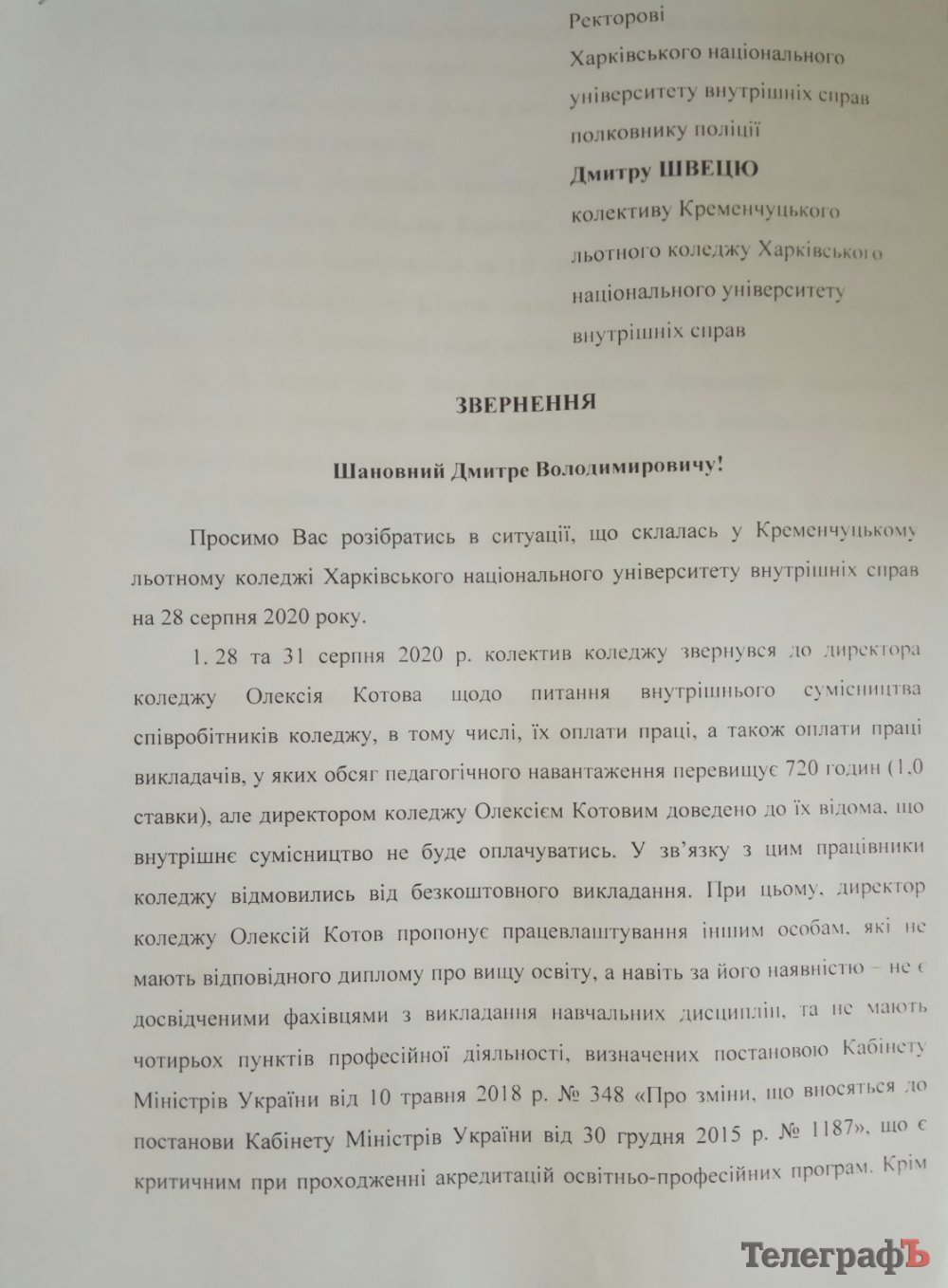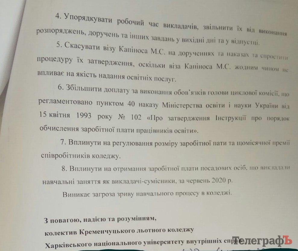 Співробітники Кременчуцького льотного коледжу поскаржилися, що їм не доплачують зарплатню, а також змушують працювати у вихідні та у відпустці. До редакції «Кременчуцького Телеграфа» надіслали листа, який колектив цього навчального закладу склав та відправив на ім’я ректора ХНУВС, полковника поліції Дмитра Швеця (нагадаємо, що зараз КЛК у підпорядкуванні Харківського національного університету внутрішніх справ).