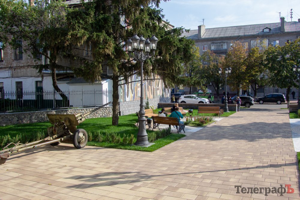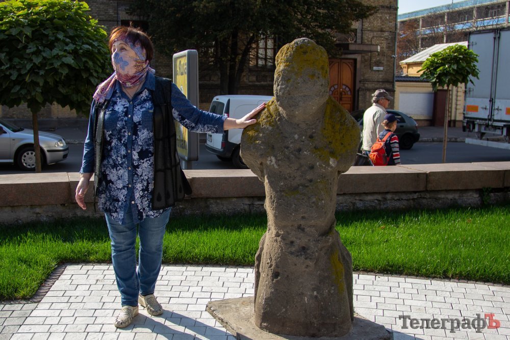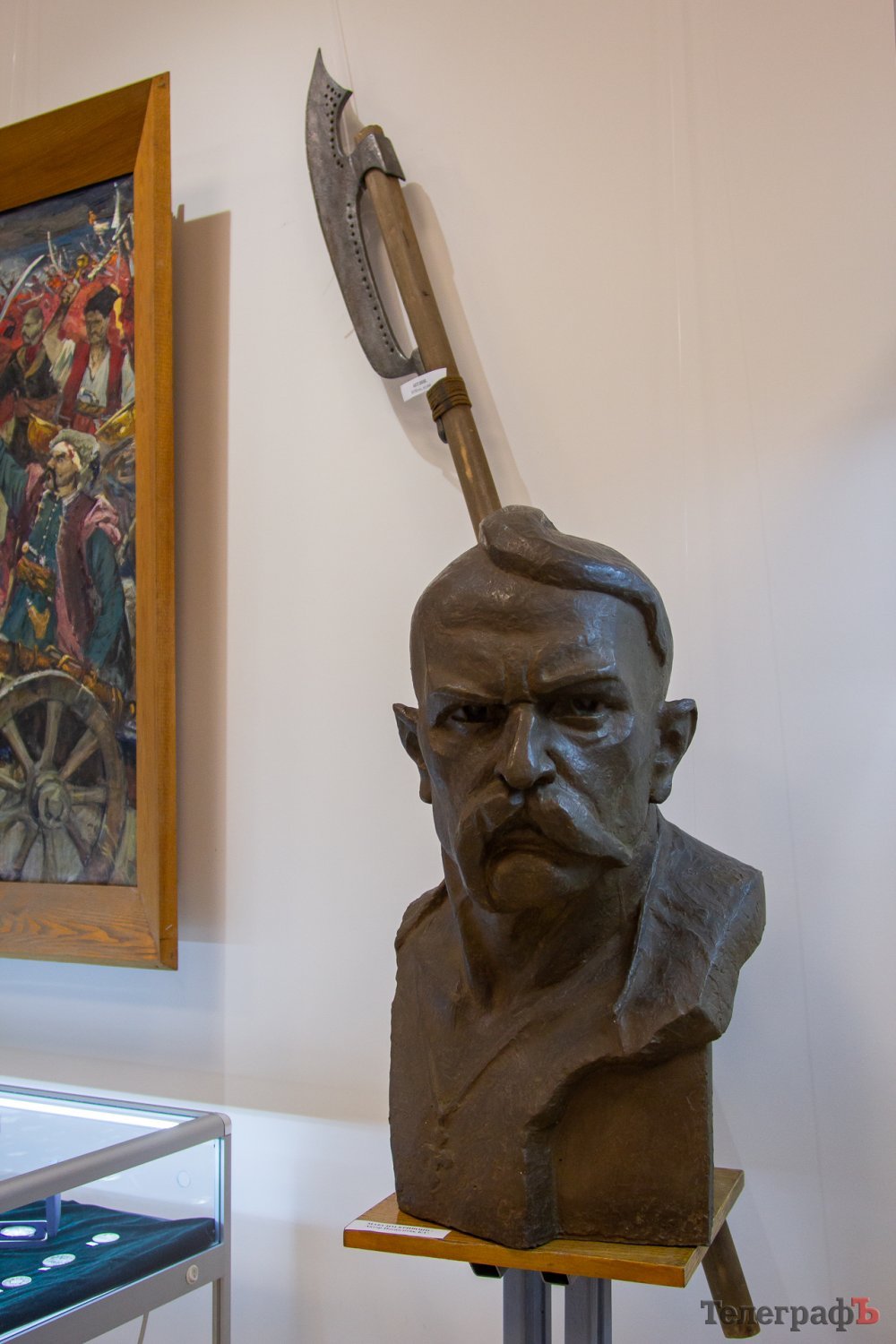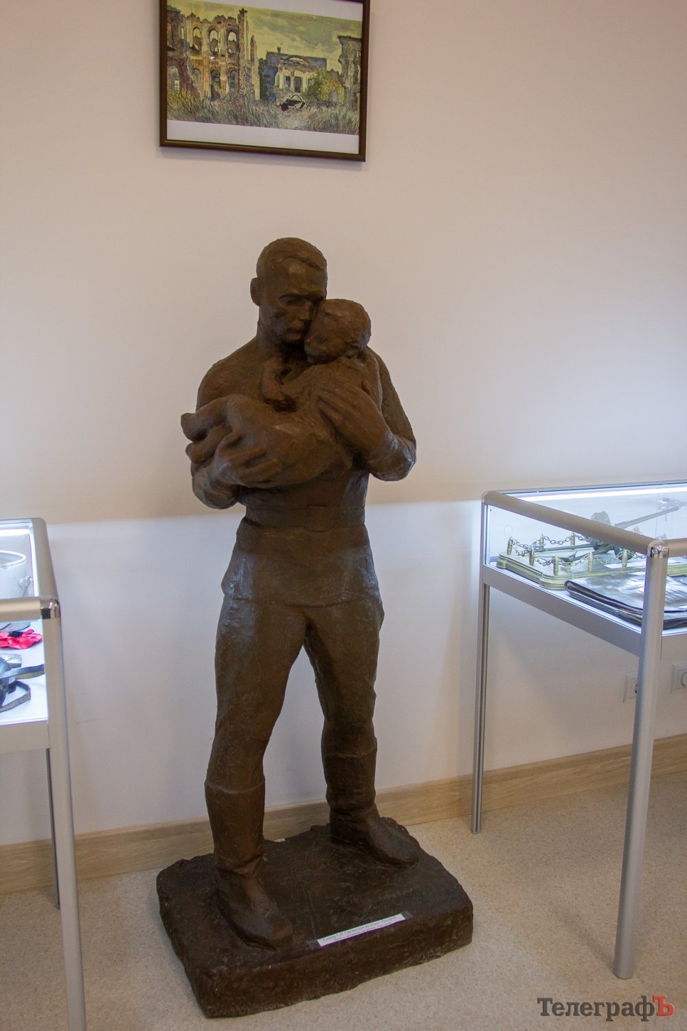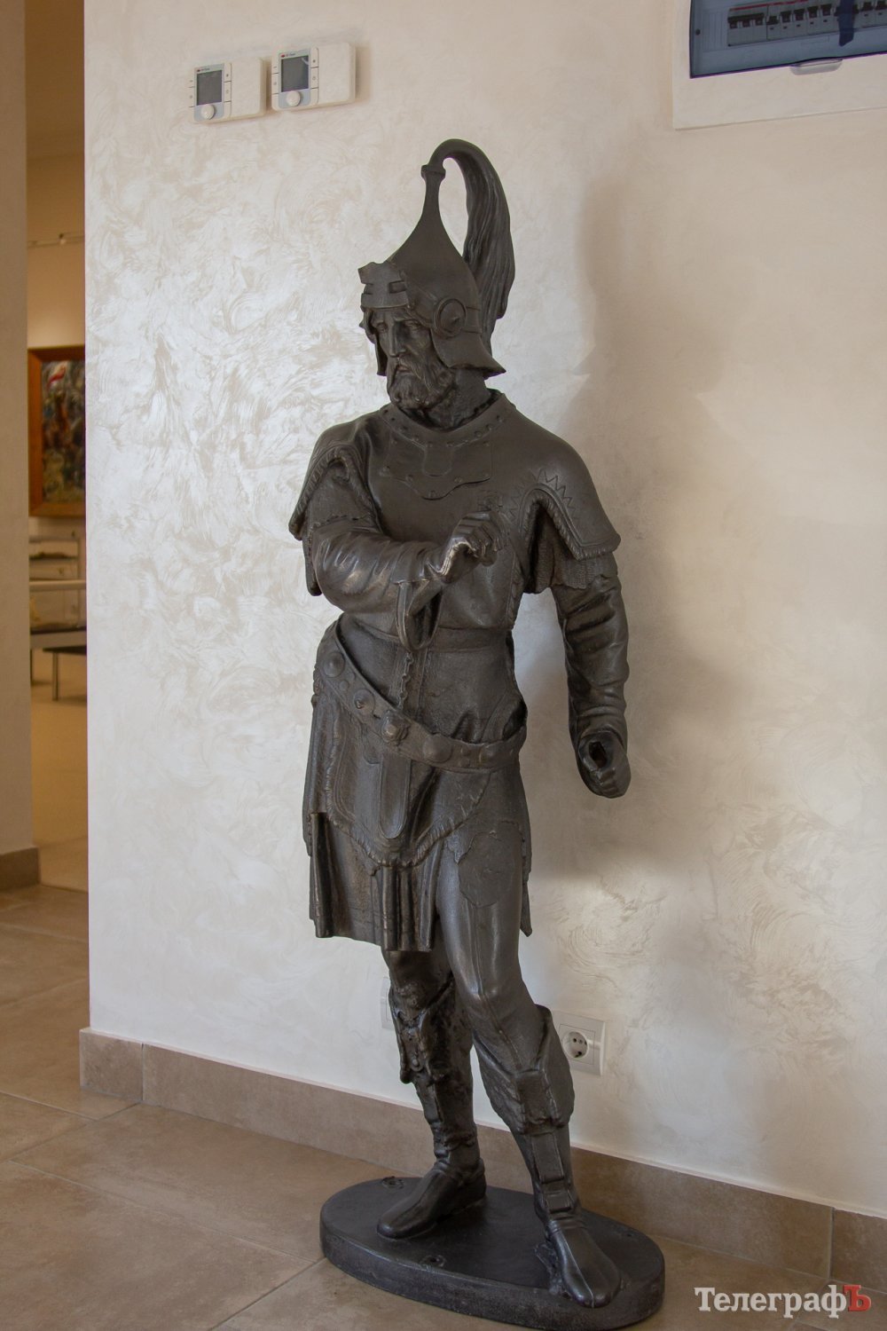 Это черный садовый рыцарь. Их было 12 и стояли они в саду у знаменитого кременчугского садовника Бера (он поставлял семена и цветы к императорскому двору в том числе). После октябрьской революции 10 рыцарей исчезли, остались двое. Много лет эти два рыцаря стояли у входа в музей. Но началась перестройка. После неё исчез ещё один рыцарь. Теперь вот остался только этот черный грустный рыцарь.
