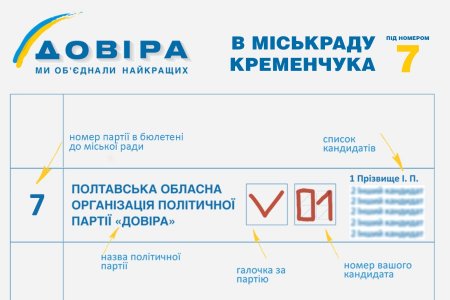 «На виборах до Кременчуцької міської ради політична партія «ДОВІРА» йде під щасливим номером 7. Упевнені, що це число принесе нам перемогу! До слова, цей бюлетень буде світло-жовтого кольору», - заявили на офіційній сторінці «Довіра Полтавщини».