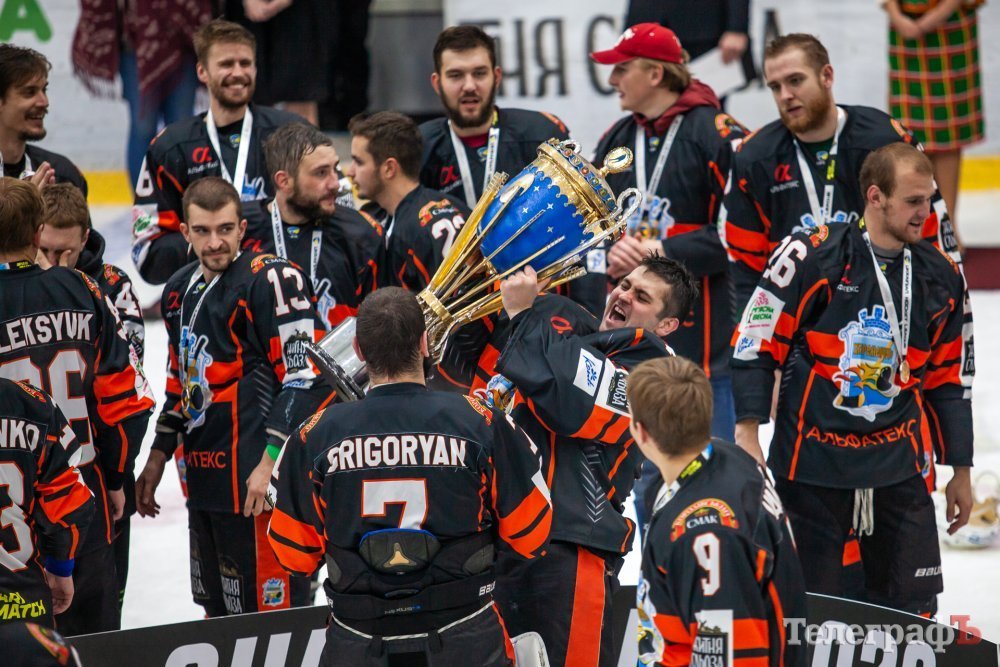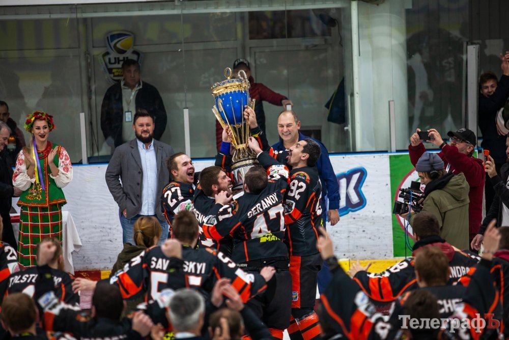 Хокеїсти «Кременчука» після важкої фінальної серії здіймають кубок над головою.