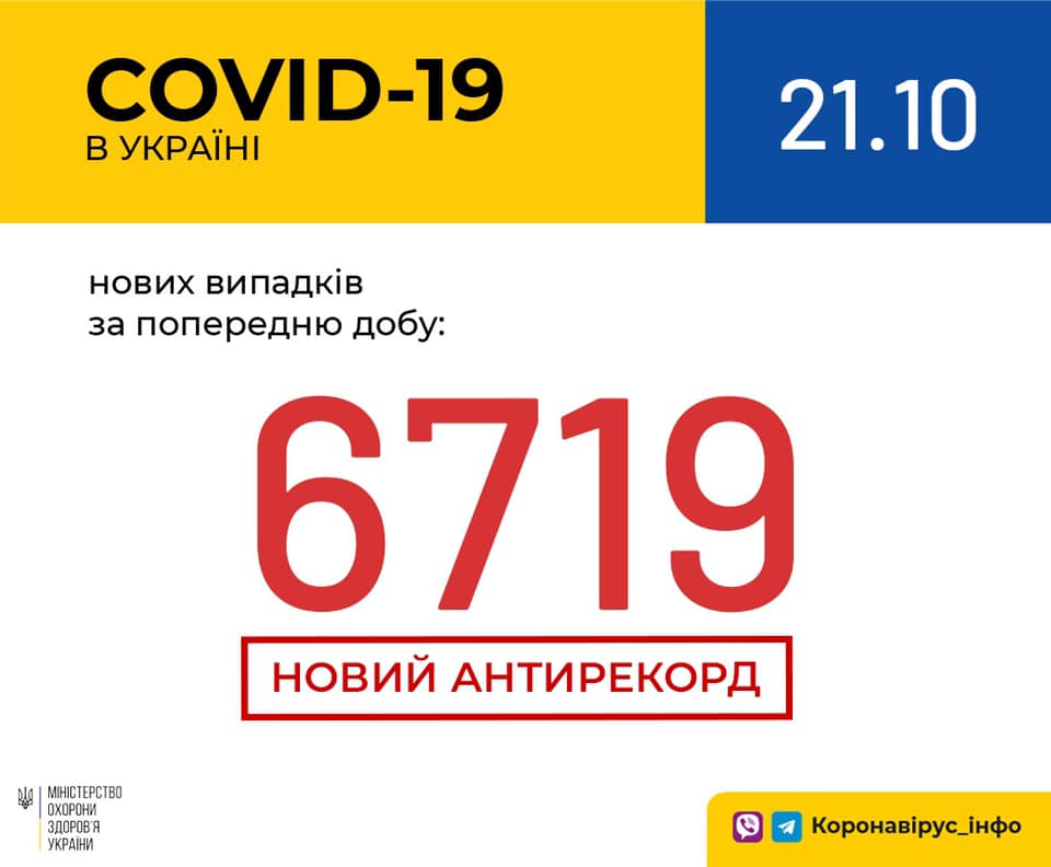 За даними МОЗу, станом на 9.00 21 жовтня в Україні 315 826 лабораторно підтверджених випадків COVID-19, із них 5 927 летальних, 132 219 пацієнтів одужали (за добу – 2 686 пацієнтів). Загалом провели 2 880 105 тестувань методом ПЛР.