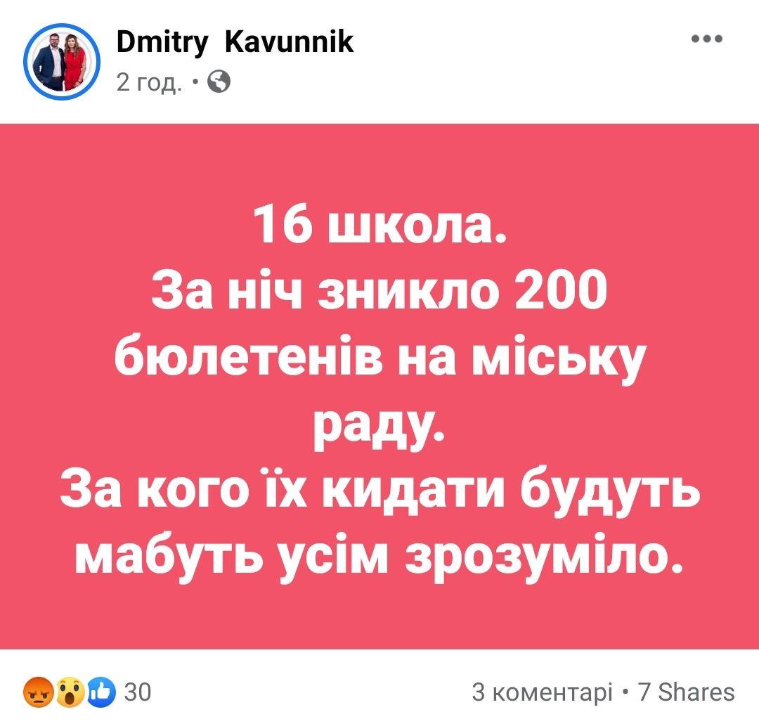 11.00 Дмитро Кавунник у соцмережах повідомив, що на дільниці у школі №16 зникла частина бюлетенів: