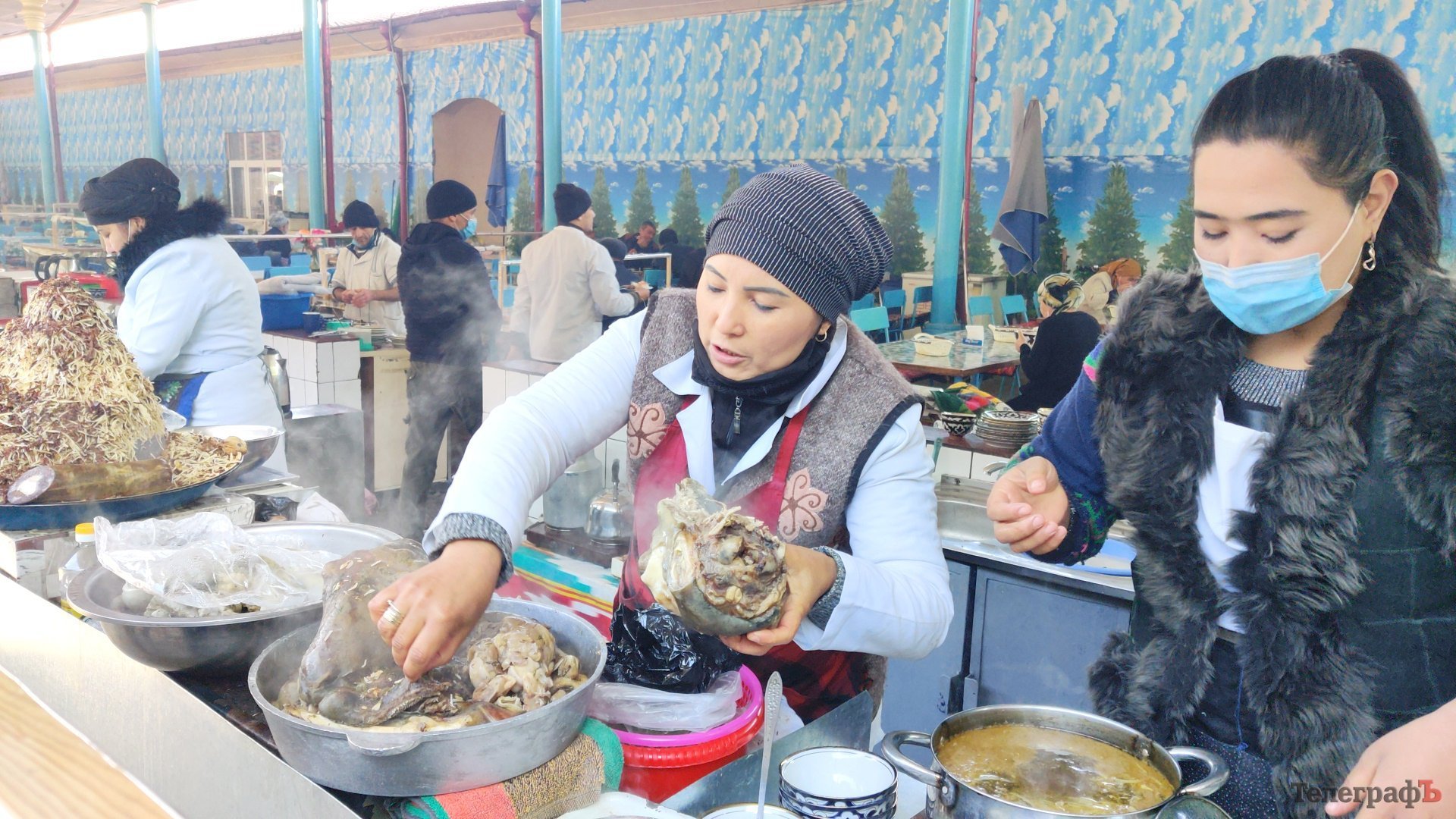 «Обжорные ряды» на знаменитом ташкентском рынке Чорсу: наши «пищевые» экстремалы из группы решили попробовать варёную баранью голову, чем вызвали небывалый ажиотаж местных торговок.