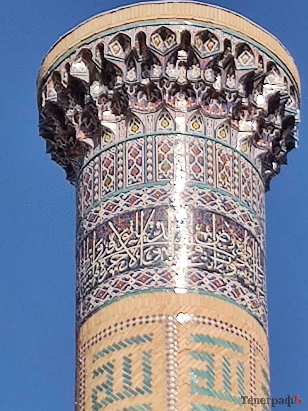 Один из полуразрушенных землетрясением, но не потерявших своё великолепие минаретов Самарканда (верхняя часть обрушена). Обратите внимание на архитектурную 3-D лепнину «юбки» минарета и цвет изразцовой плитки — такую красоту сейчас уже не производят…