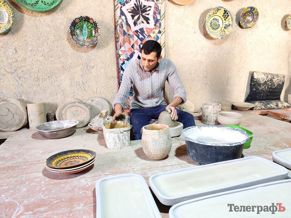 Мастер-гончар в 6-м поколении из города Гиждуван (рядом с Бухарой). Вся посуда, изготовленная его руками, делается по древним рецептам без применения химических красителей. К примеру, глазурь красноватого цвета изготавливается методом выжигания какого-то пустынного растения в ямах и перетирания продуктов сгорания в порошок на каменных жерновах. Обжиг посуды происходит в глиняных печах. Соответственно, тарелка для плова стОит здесь от 80 до 250 долларов.