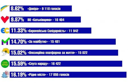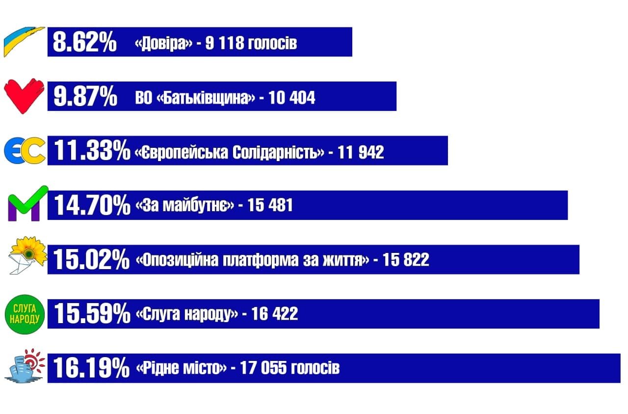 - 16,19% «Рідне місто» - 17 055 голосів (9 мандатів);