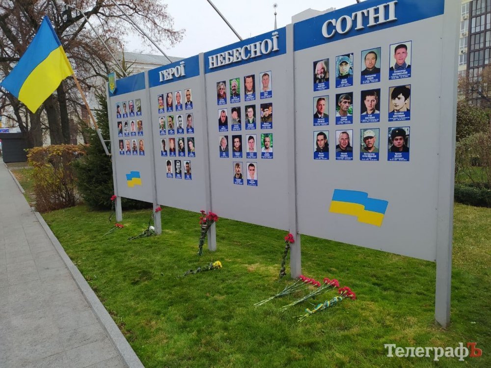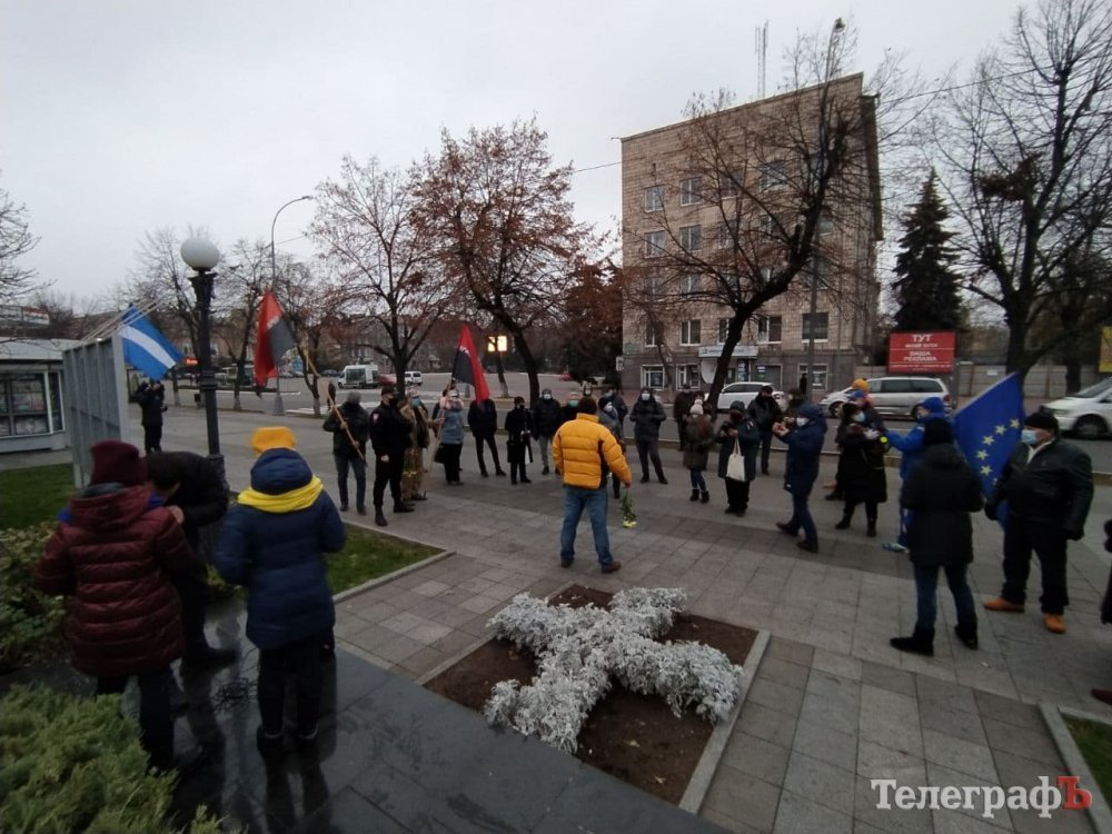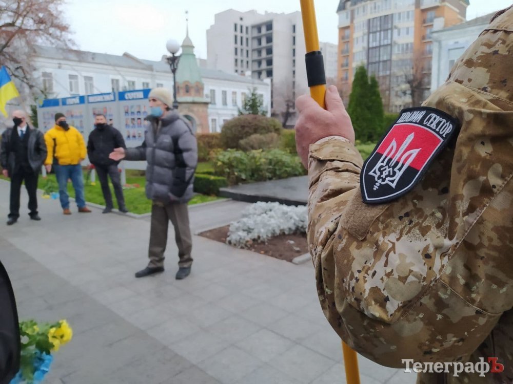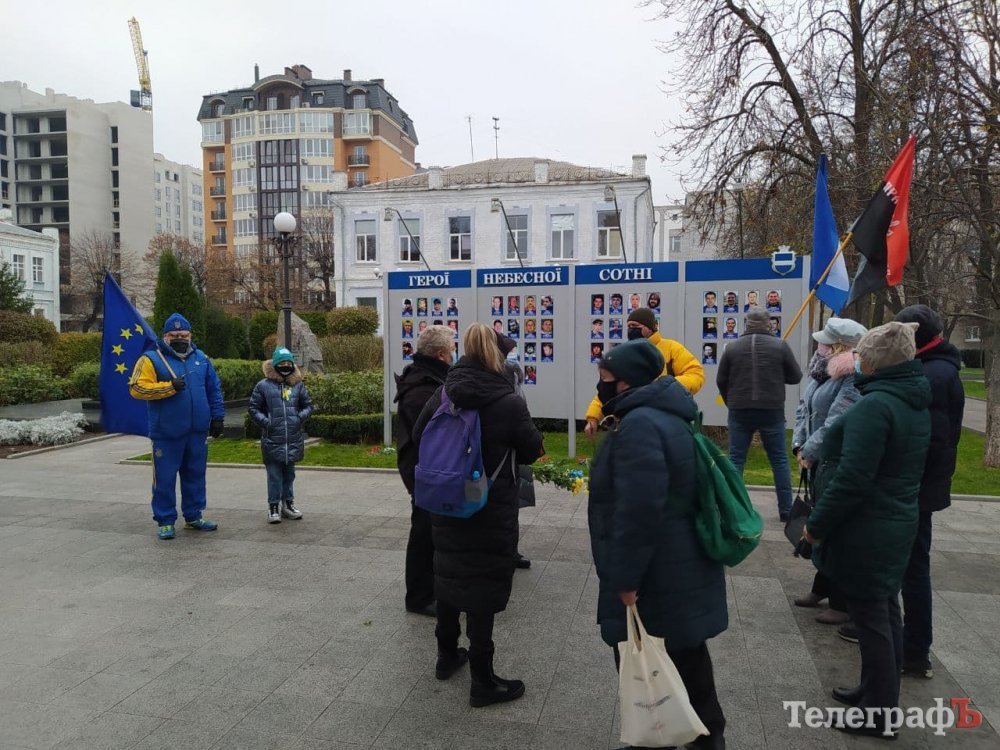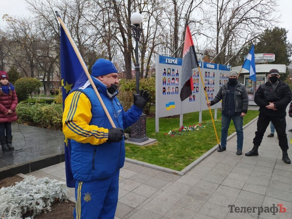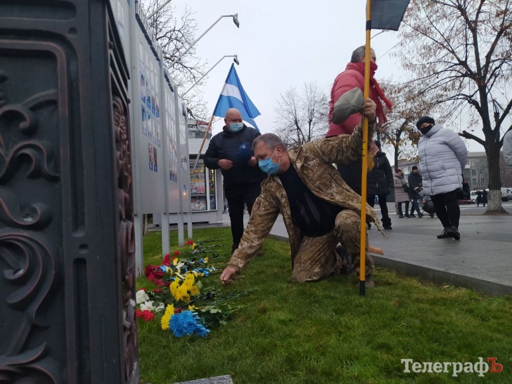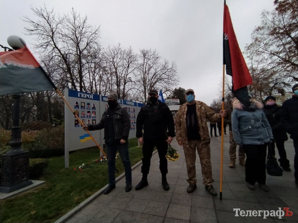Кременчужани зібралися біля стели героям Небосної сотні під тими ж прапорами, з якими виходили на Євромайдан 7 років тому: прапором України, Євросоюзу, Правого Сектору.