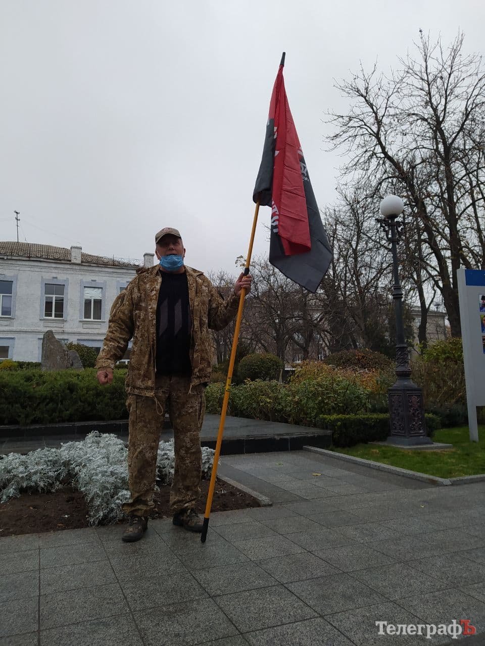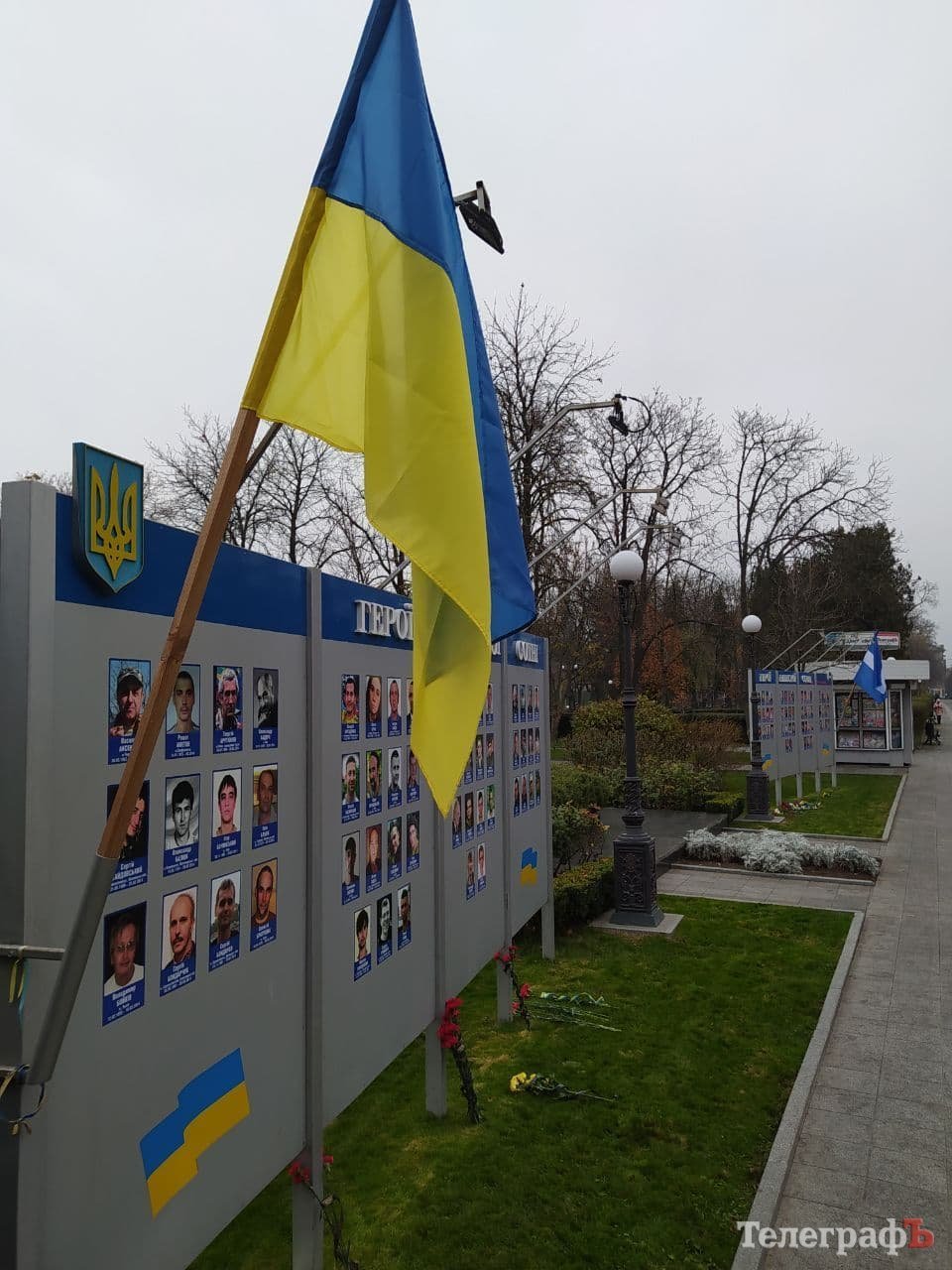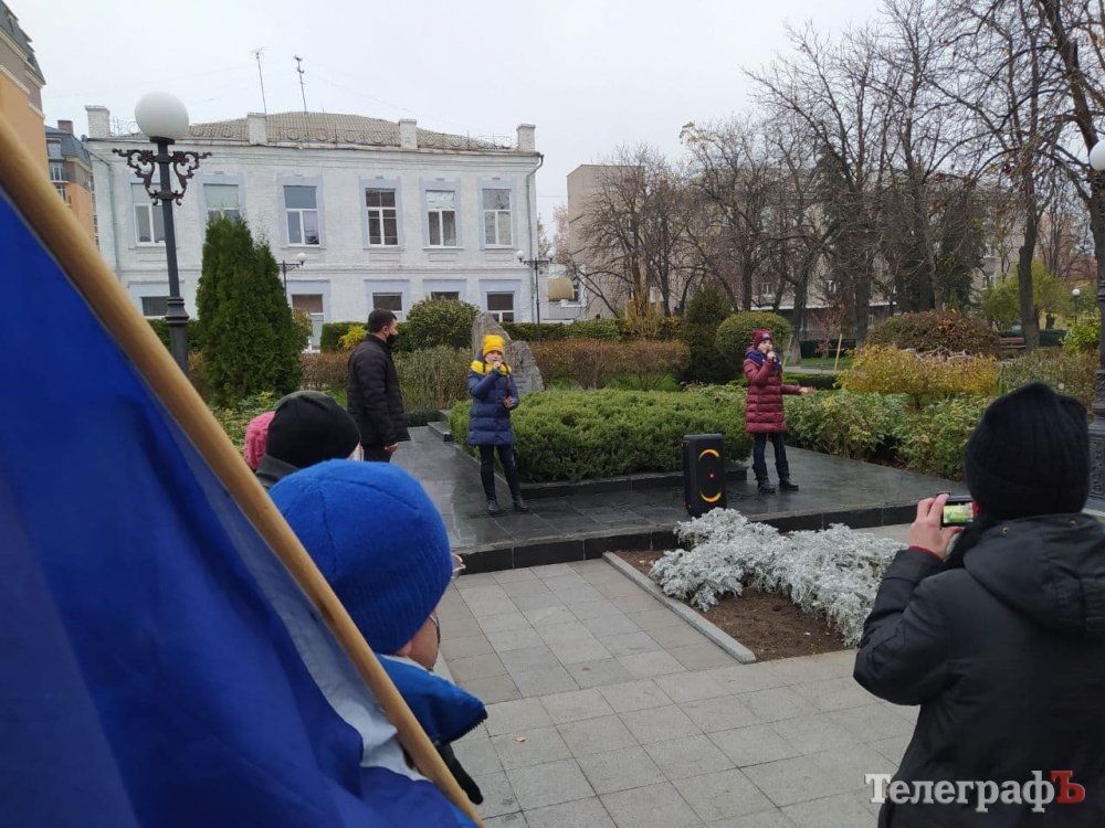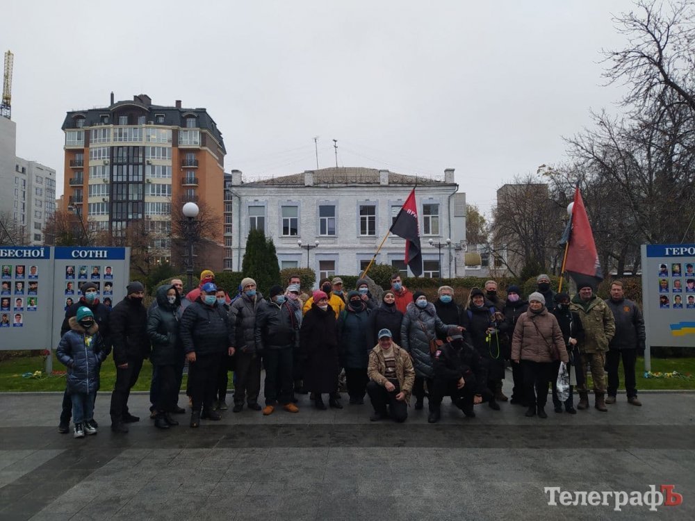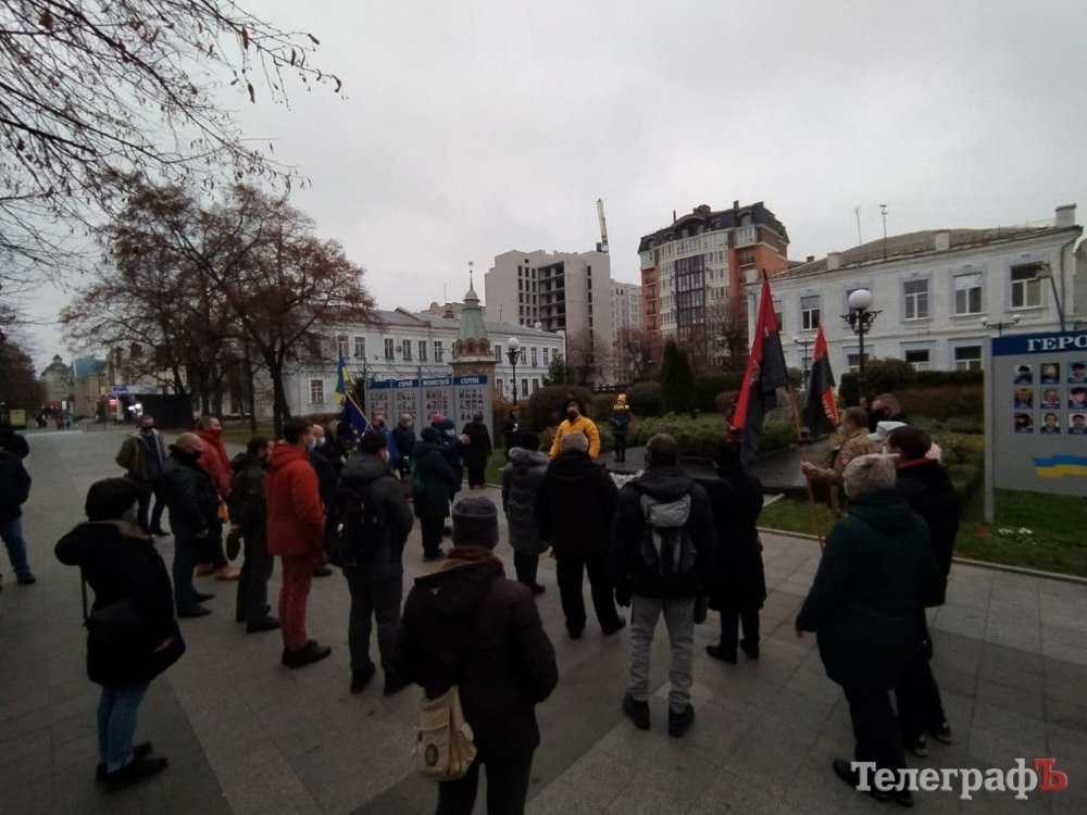 Кременчужани зібралися біля стели героям Небосної сотні під тими ж прапорами, з якими виходили на Євромайдан 7 років тому: прапором України, Євросоюзу, Правого Сектору.