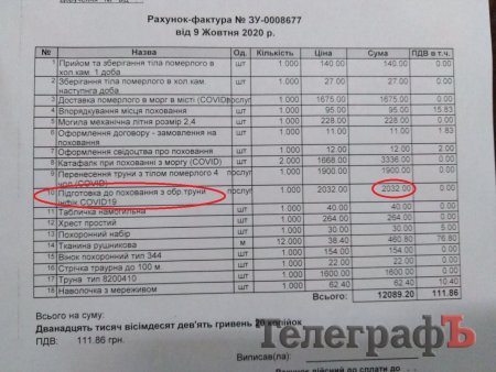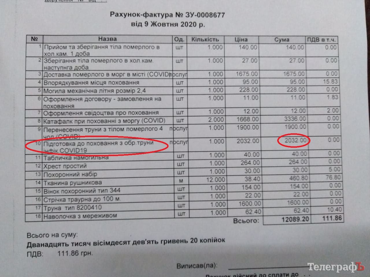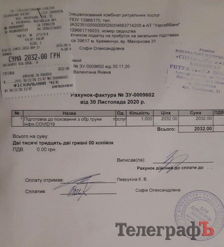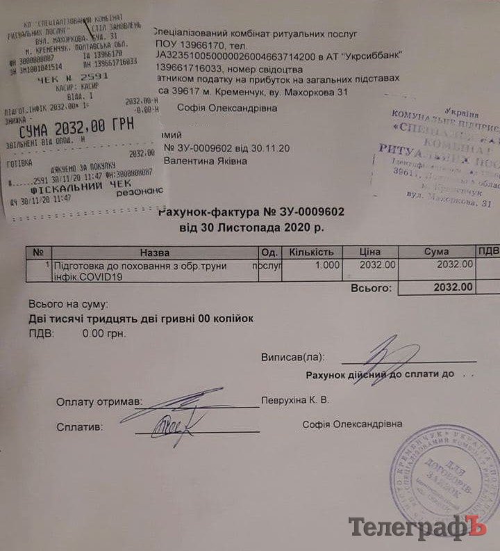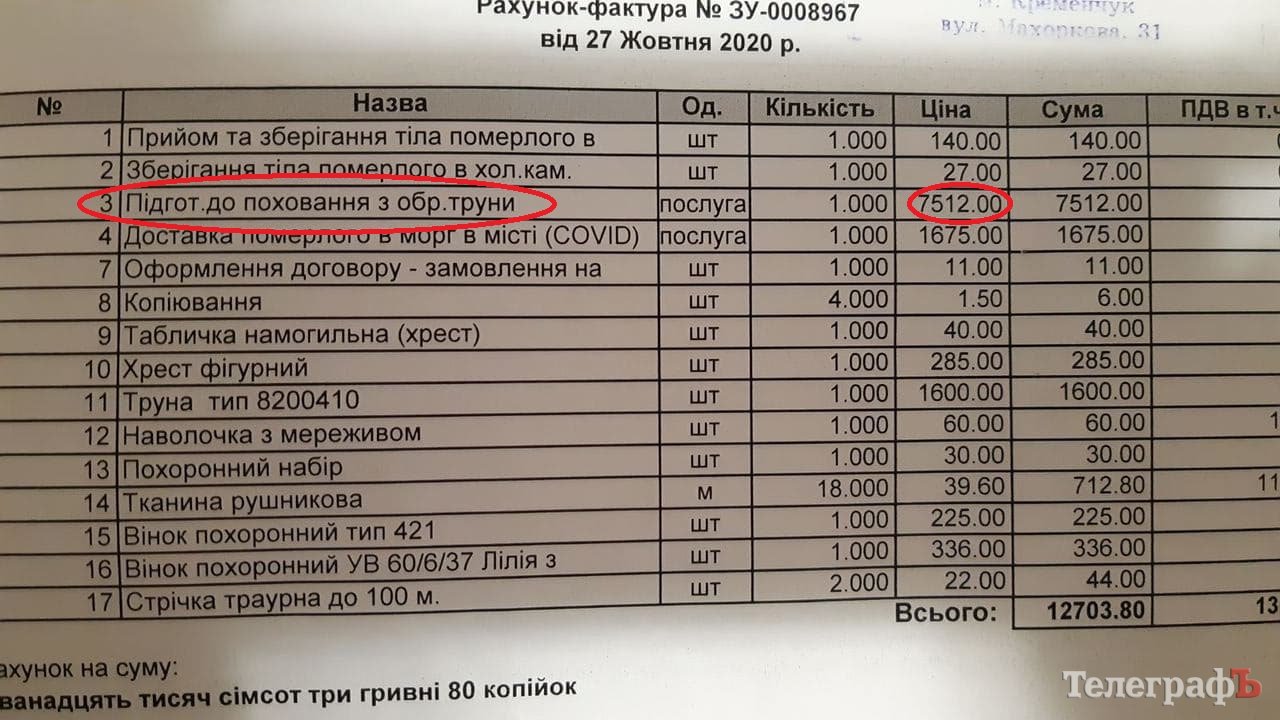 До редакції звернулася кременчужанка Софія. Її мама померла від COVID-19 наприкінці жовтня 2020 р. Організацією поховання займалося СКРП. Першочергова сума, яку озвучили дочці покійної за пакет послуг, була близько 19 000 грн. Родичі покійної відмовилися від транспортування, після перерахунку сплатили 12 703,80 коп.