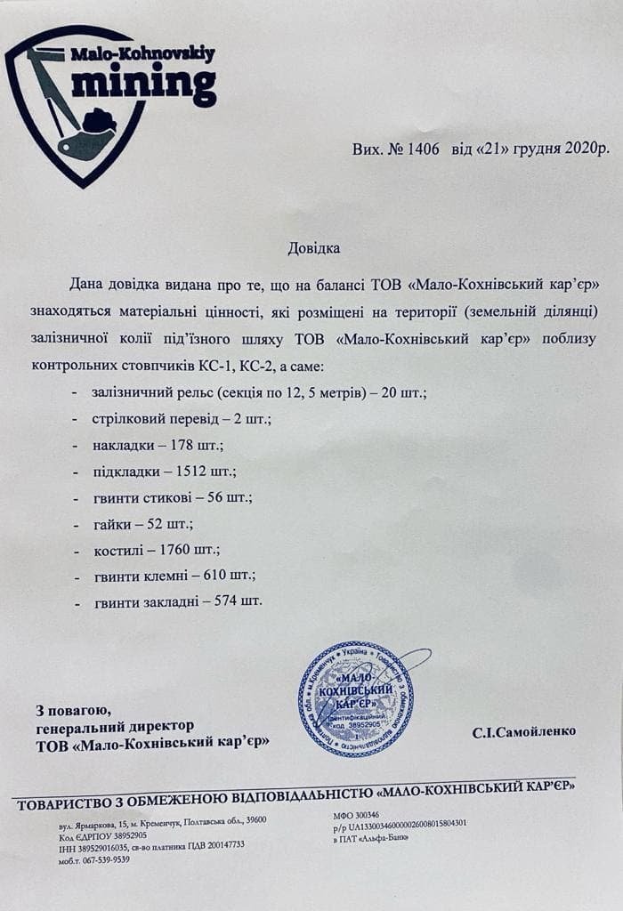 Головний інженер Малокохнівського кар’єру повідомив нам, що поліцейські забрали ключ і техпаспорт від трактору. Цим вони паралізували роботу на ділянці. Зазначимо, що нам надали договір про оренду землі, де розташоване майно кар’єру. До того ж, ми отримали довідку цього підприємства, у якій зазначено, що рейки на даній ділянці перебувають на балансі кар’єру.