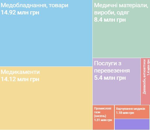 На таблиці та у діаграмі ми бачимо, що найбільша сума коштів – майже 15 мільйонів гривень – витрачена на медичне обладнання, також у цьому розділі ми рахували медичну апаратуру та інші вироби медичного призначення (не враховуючи медичний одяг).