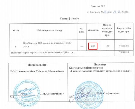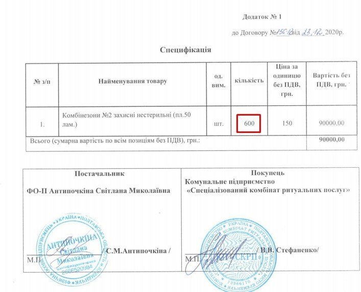 У грудні СКРП знову уклав дві угоди на купівлю захисних костюмів. Одна партія (600 штук) – по 150 грн за штуку, інша (багаторазові, 300 штук) – по 450 грн за штуку.