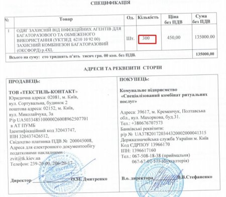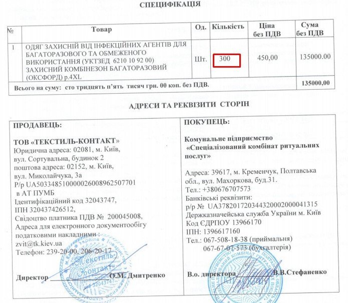 Тут лідером був і залишається «Спеціалізований комбінат ритуальних послуг». Ми вже писали про ізоляційні водостійкі костюми по 750 грн за штуку. І, порівнюючи ціни, дійшли висновку, що навіть для костюму багаторазового використання ціна завищена.