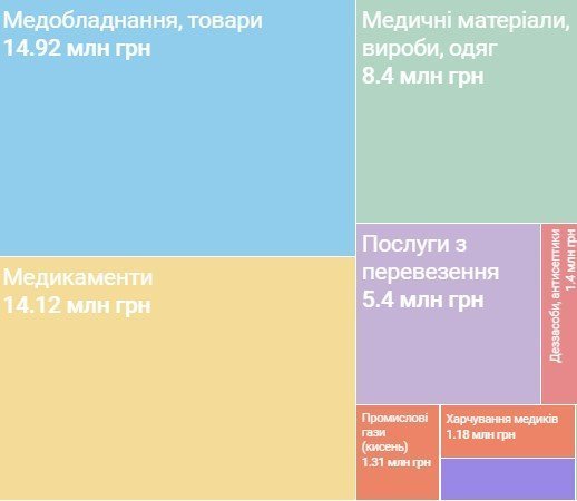 На третьому місці – медичні матеріали, вироби, одяг. Сюди входять маски для обличчя, респіратори, халати, медичні шапочки та рукавички, комбінезони та інший спеціальний одяг для медпрацівників і не лише. Загальна сума витрат на це склала 8,4 млн грн.