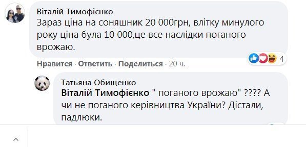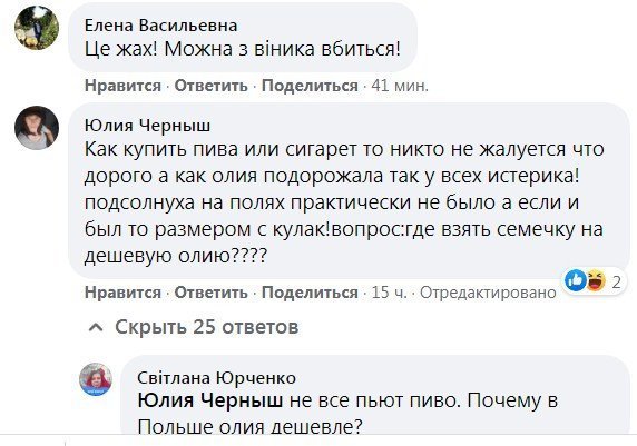 «Ціна бомба», справді, підірвала мережу: люди активно коментують злет ціни на пляшку олії, яка (за літр) перетнула 50 грн. Одні обурюються тим, що пляшка олії в Польщі коштує дешевше. Інші пишуть про неврожай соняшника (що, дійсно, мало місце через посуху — про це пишуть спеціалізовані аграрні видання).