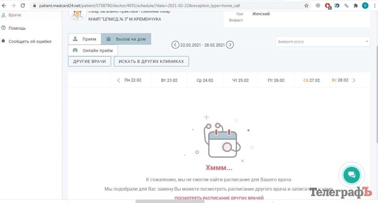 - Также есть функция вызова врача на дом, но она у нас не сработала: невозможно было выбрать время приема.