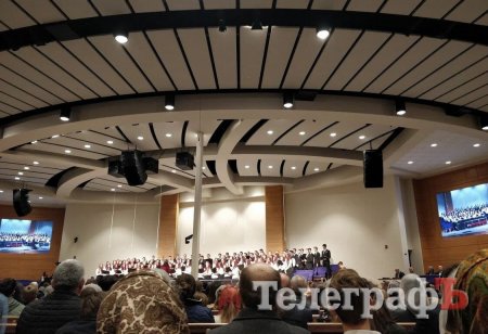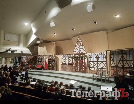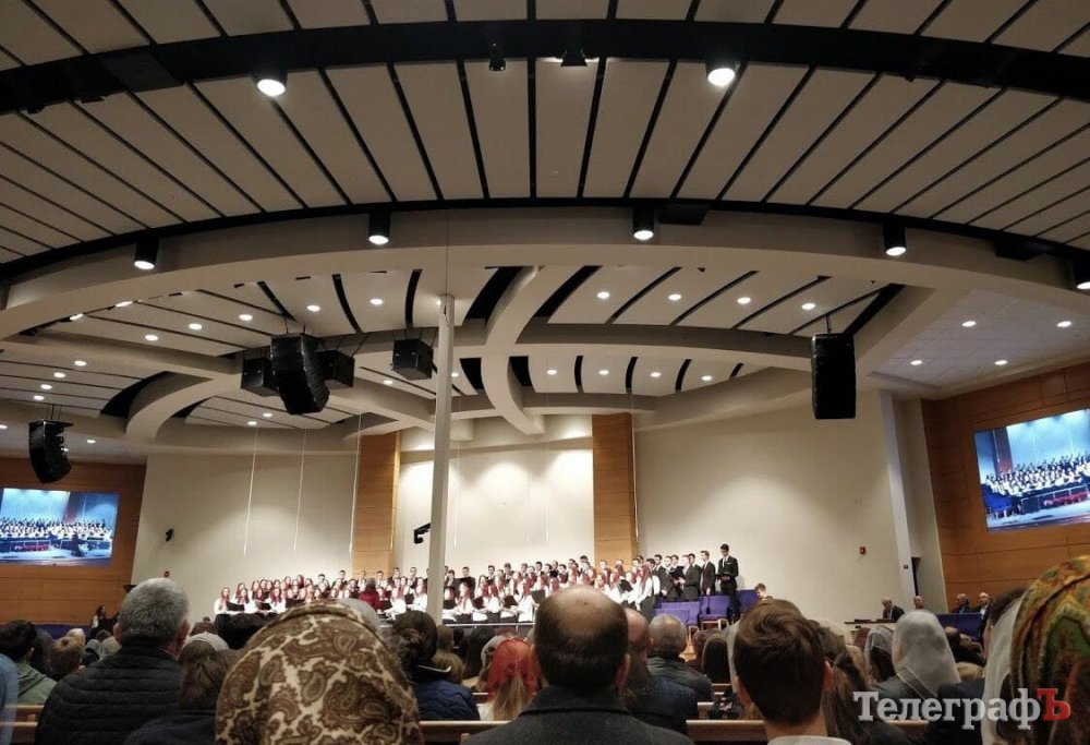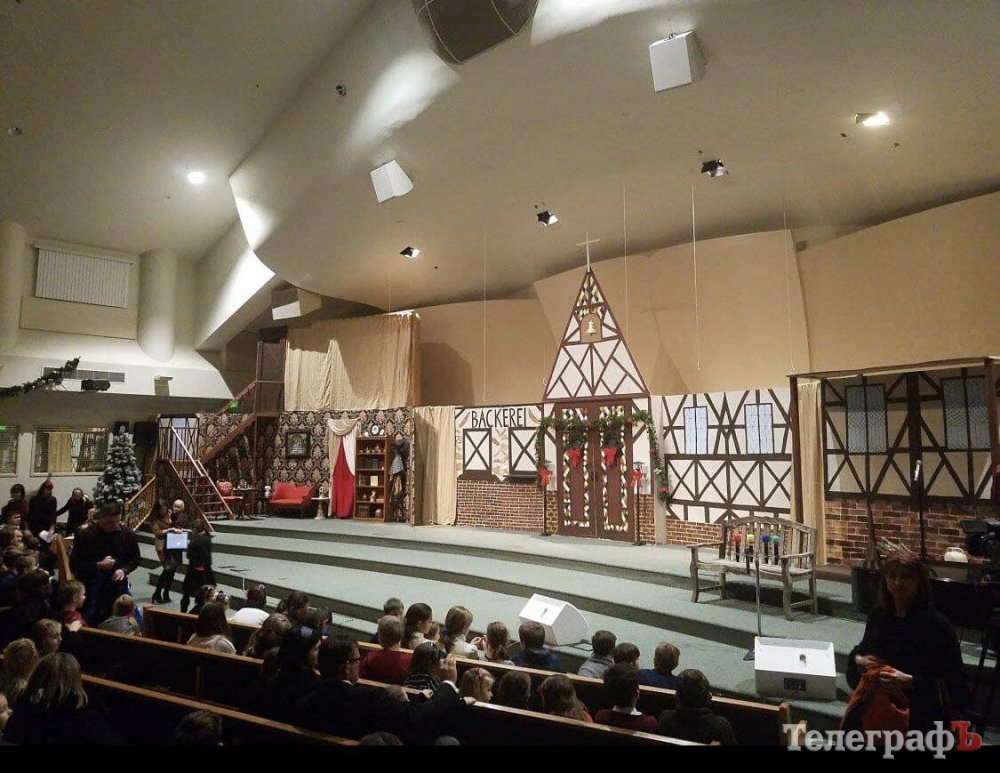 В крупных церквях во время службы все происходящее на сцене транслируется на большой экран (их может быть несколько).
