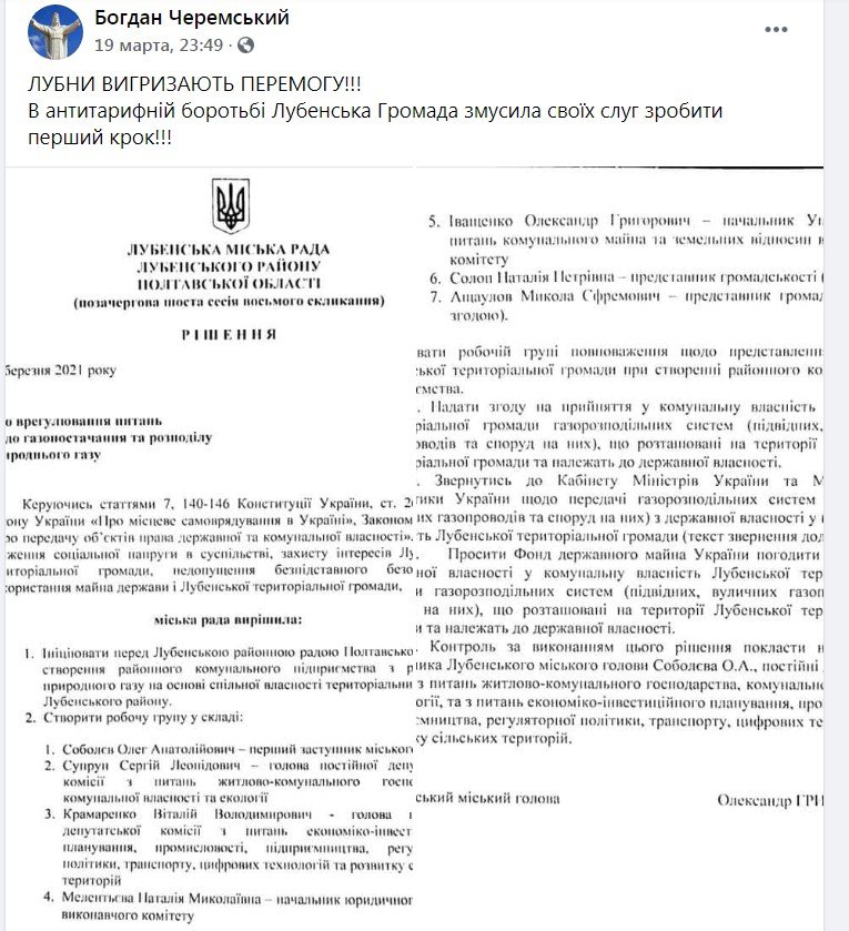Коментуючи свою ініціативу «Телеграфу», Гордєєва посилається на те, що проєкт рішення про створення КП з розподілу природного газу вже виносять на розгляд міської ради у Лубнах. При цьому громада ініціює передачу газорозподільних мереж у комунальну власність.