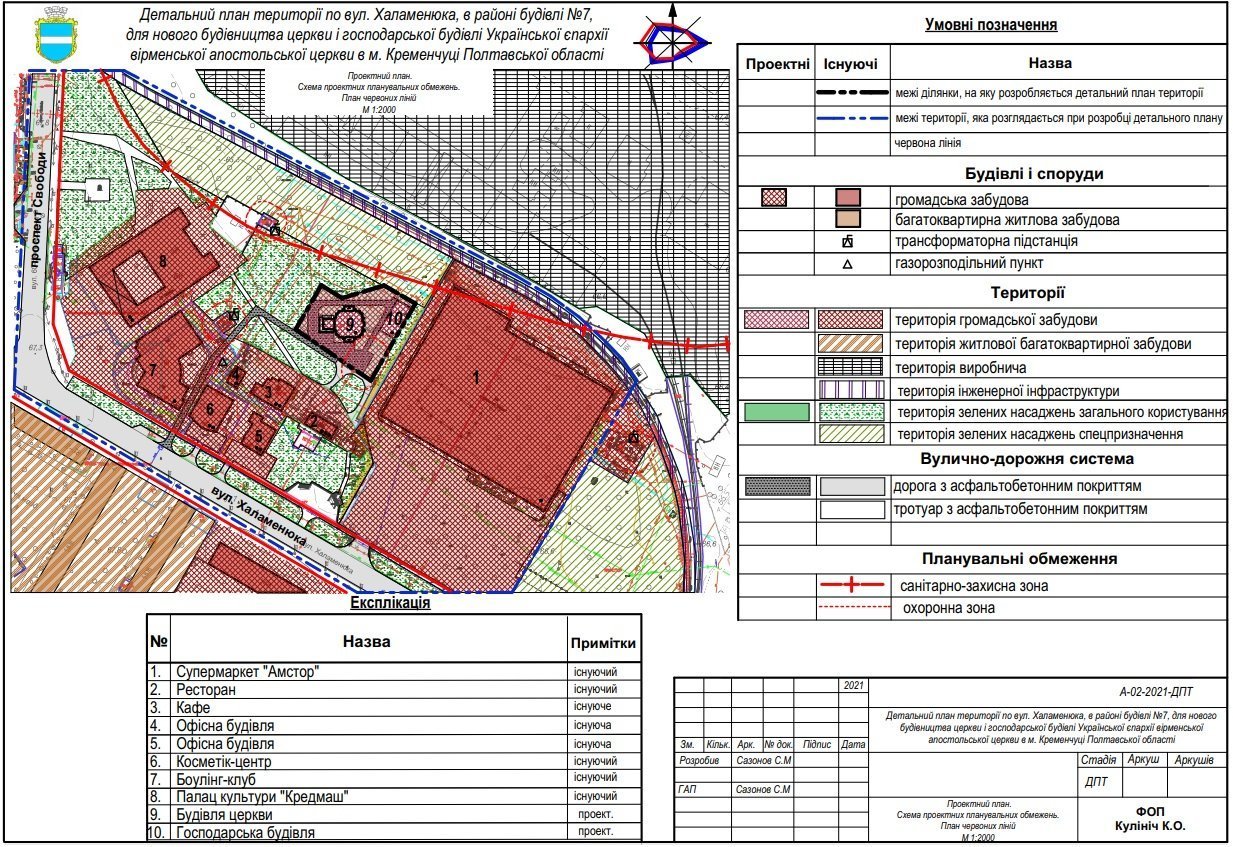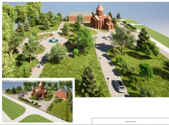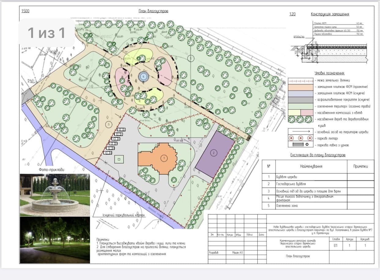 На схемі праворуч знаходиться Амстор, зверху – залізна дорога. Помаранчевим позначено церкву, а фіолетовий прямокутник – недільна школа. Поруч з церквою передбачено парковку. Трохи вище по схемі фонтан з лавками та невисокими світильниками.
