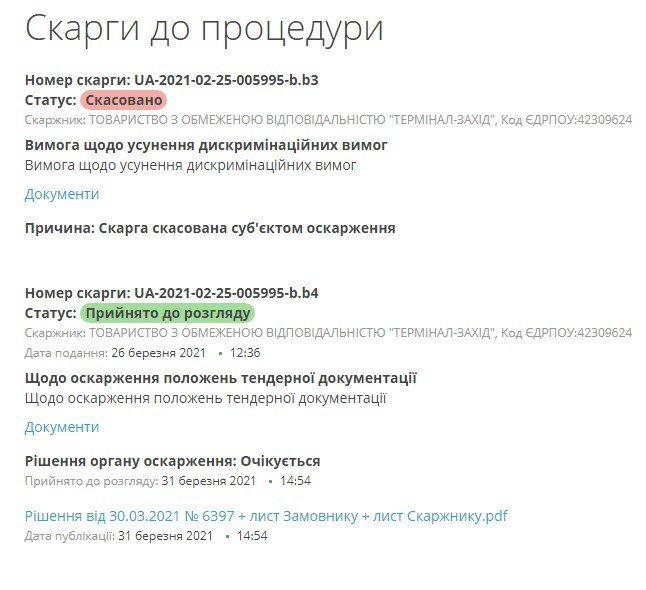 Відповідно до умов закупівлі (відкриті торги з публікацією англійською мовою), зазначених у початковому оголошення, тендер мав відбутися 5 травня. Та наразі його дата не визначена, оскільки АМКУ має винести рішення по скарзі.