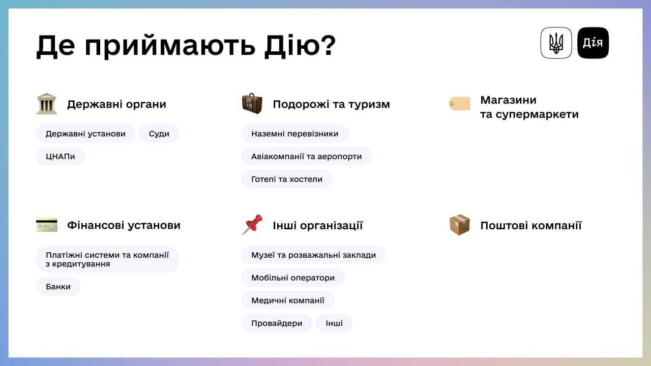 До 23 августа у нас переходный период, так что примут/не примут – 50/50. В «Дії» указано, что цифровые паспорта принимают госучреждения, финучреждения, платежные системы, банки, музеи, мобильные операторы, компании провайдеры, наземные перевозчики, авиакомпании, аэропорты, отели и хостелы.