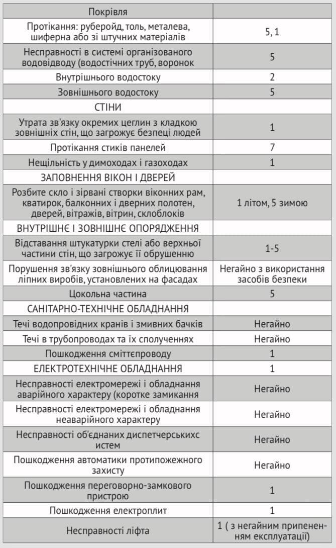 Граничні строки невідкладної ліквідації виявлених несправностей елементів житлових будинків: