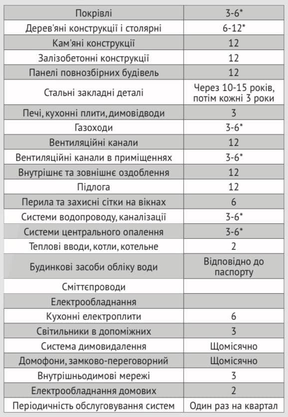 *Конкретна періодичність оглядів у межах становленого інтервалу встановлюється експлуатаційними організаціями, виходячи із технічного стану будівлі та місцевих умов