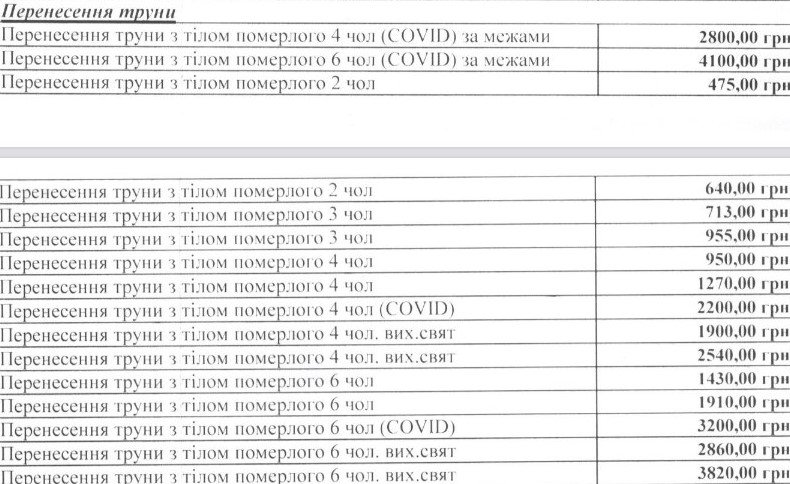На думку людей, ціни для небіжчиків, які померли внаслідок перенесеного COVID-19, значно відрізняються від цін для померлих з інших причин. Приміром, катафалк в першому випадку обійдеться 1772 гривень, в другому – 1163 гривень. Перенесення труни родичам людини, яка померла від COVID, теж обійдеться майже на 1000 гривень дорожче.