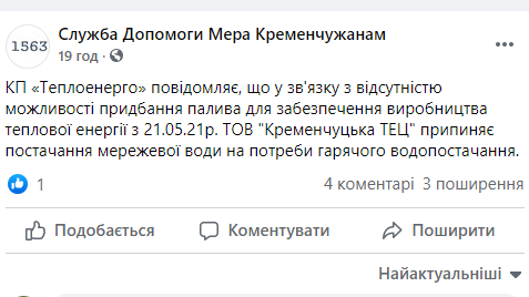 21 травня на Facebook-сторінці Служби допомоги мера кременчужанам о 12.49 навіть з’явилась відповідна інформація.