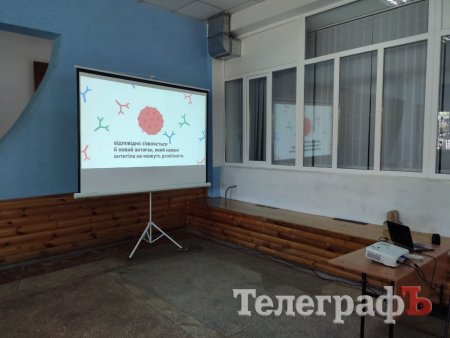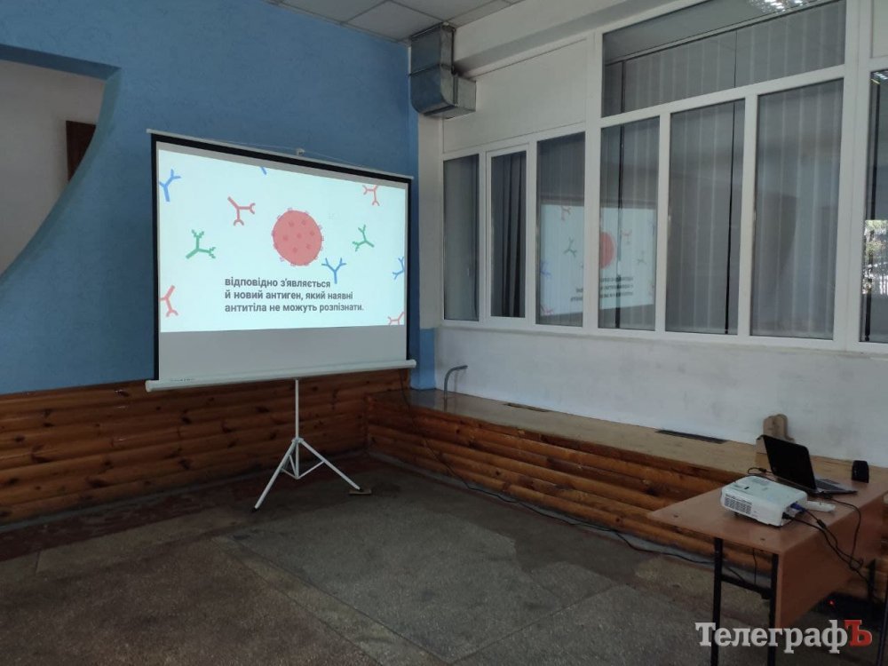 Тут, в холі ліцею, можна переглянути пізнавальне відео про те, як саме працює вакцина від COVID-19.