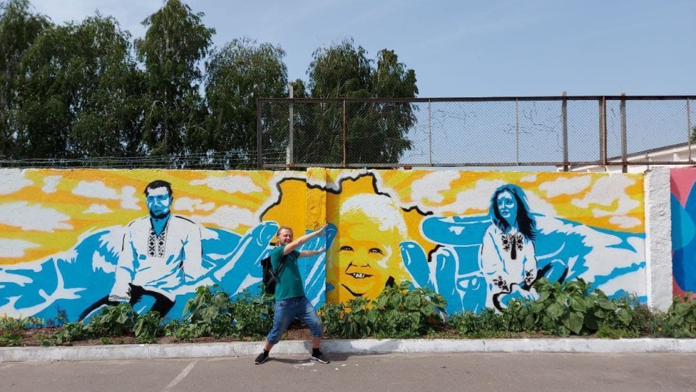 – Мене запросили на цю подію через інстаграм, і для мене це було вперше, я ніколи не розмальовувала такі формати, стіни. Але я вважаю, що художник, якщо він вміє малювати, то може це робити на будь-якій поверхні, треба лише дізнатися нюанси. Було складно тому, що коли ти малюєш на маленькому полотні, то можеш відійти і подивитися здалеку. Але щоб відійти і подивитися здалеку на стіну, треба дуже далеко відходити. Коли ти знаходишся близько, не видно загальної картини і легко зробити помилки. Тому, щоби перенести це зображення з ескізу на паркан, я використовувала будівельний метод – ми наносили сітку за допомогою нитки і синьої крейди. Нитку натягували і відбивали сині полоси, поділили стіну на квадрати 25 х 25 см. Фарби швидко висихали і, щоб зробити градієнт – коли з одного кольору перетікає в інший, треба було працювати швидко.