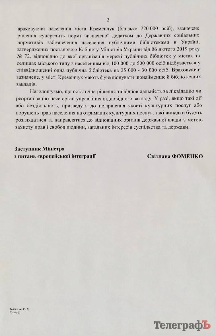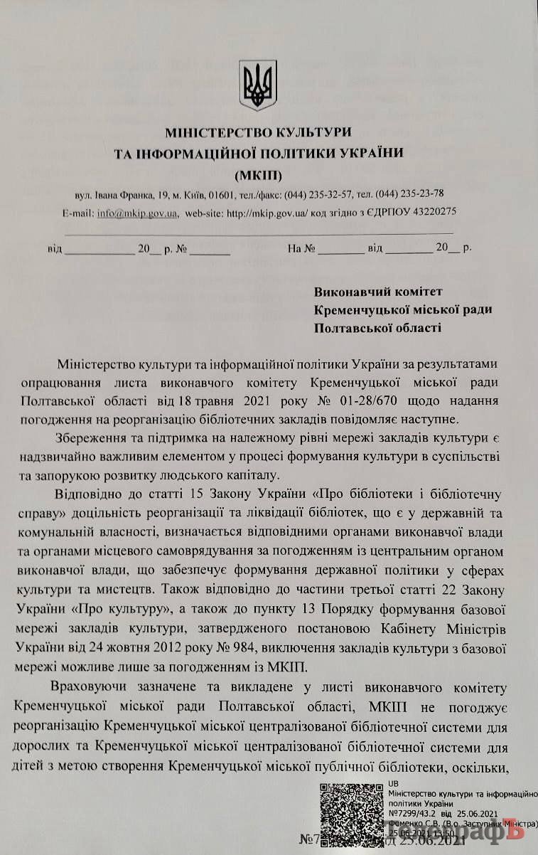 Як стало відомо «Телеграфу» з власних джерел, Кременчуцька міська рада, ще в п’ятницю отримала дуже цікавого листа, але оприлюднити його зміст можновладці не наважилися. І зрозуміло чому, адже Міністерство культури та інформації розглянуло звернення Виконавчого комітету Кременчуцької міської ради і не погодило реорганізацію бібліотечної системи, яку раніше анонсував мер Віталій Малецький. Відповідне рішення мають затвердити депутати на сесії Кременчуцької міської ради вже сьогодні, 30 червня. Можливо саме тому цього листа не поспішали оприлюднити. Аби депутати проголосували не розуміючи, що прийняття такого рішення суперечить діючим законодавчим нормам.