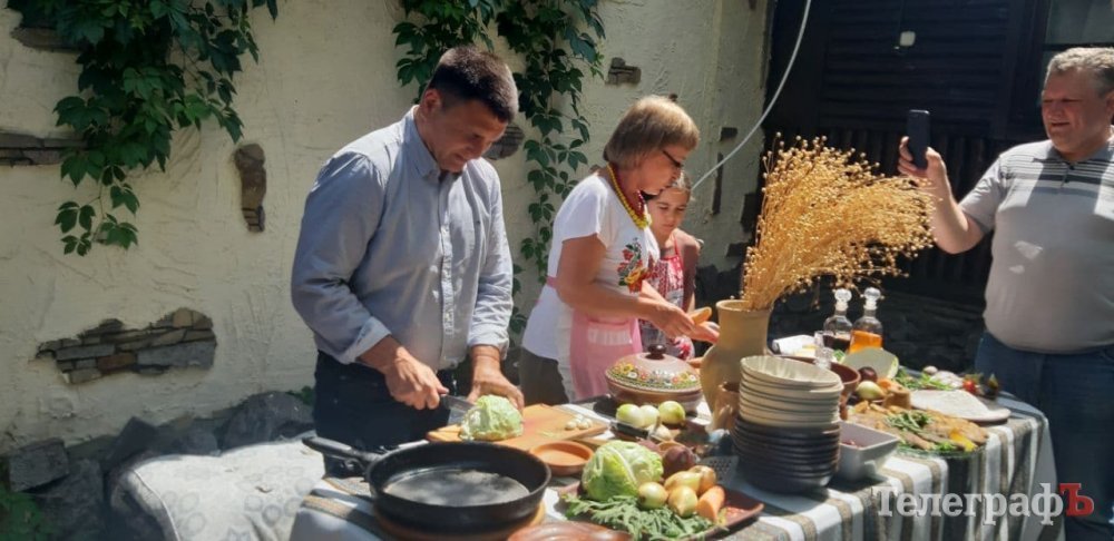 До приготування автентичної страви, борщу з карасями, долучився сьогодні колишній міністр закордонних справ Павло Клімкін. Зустрічали поважного гостя настоянкою на півонії та піснею.