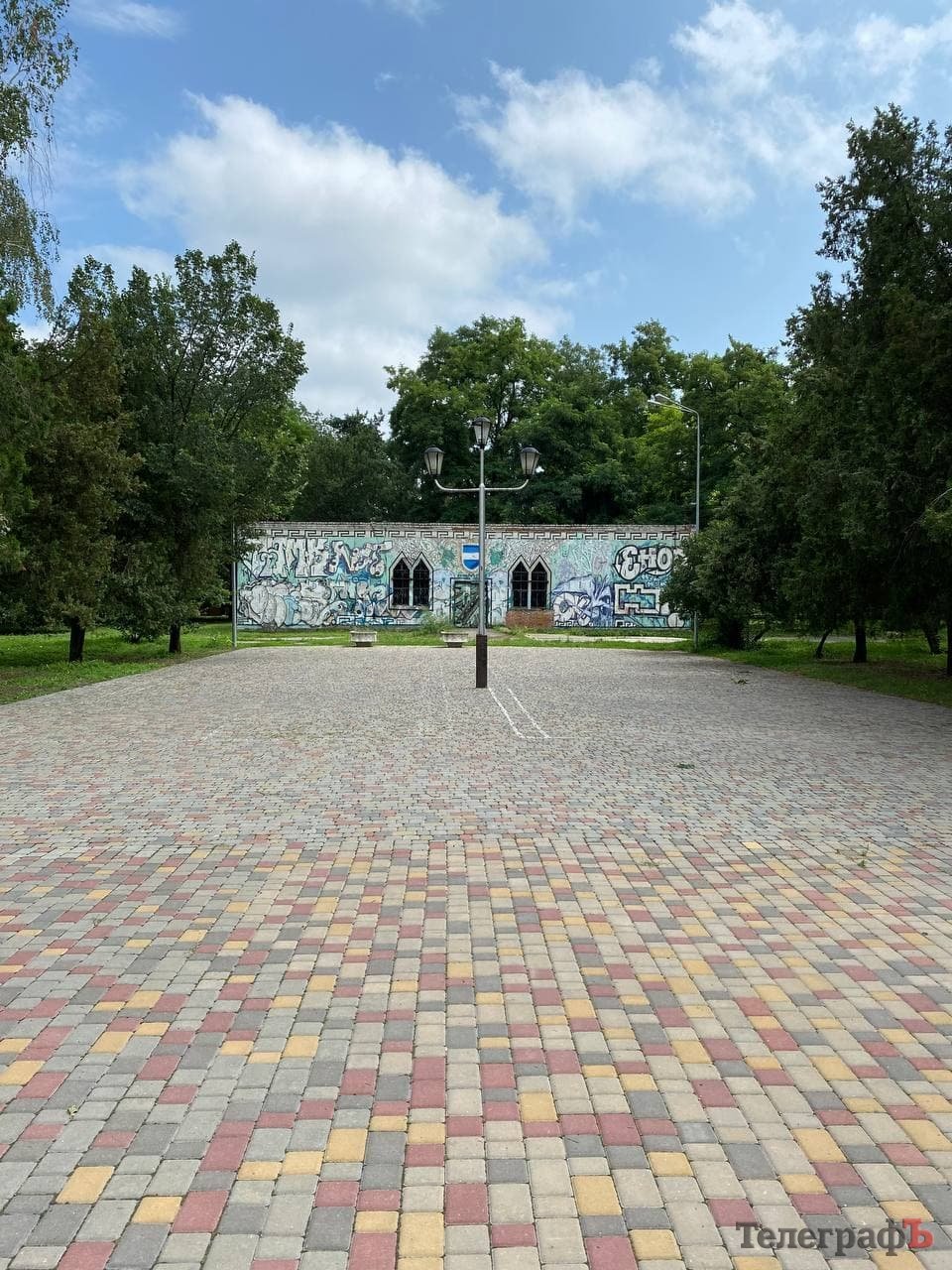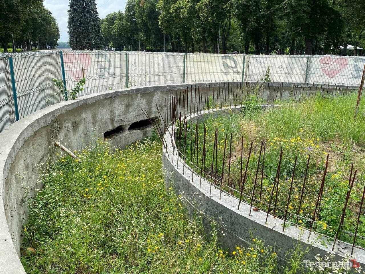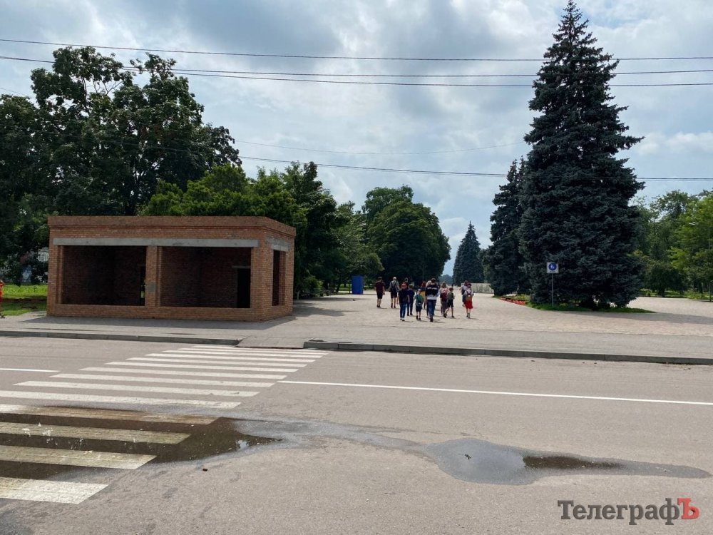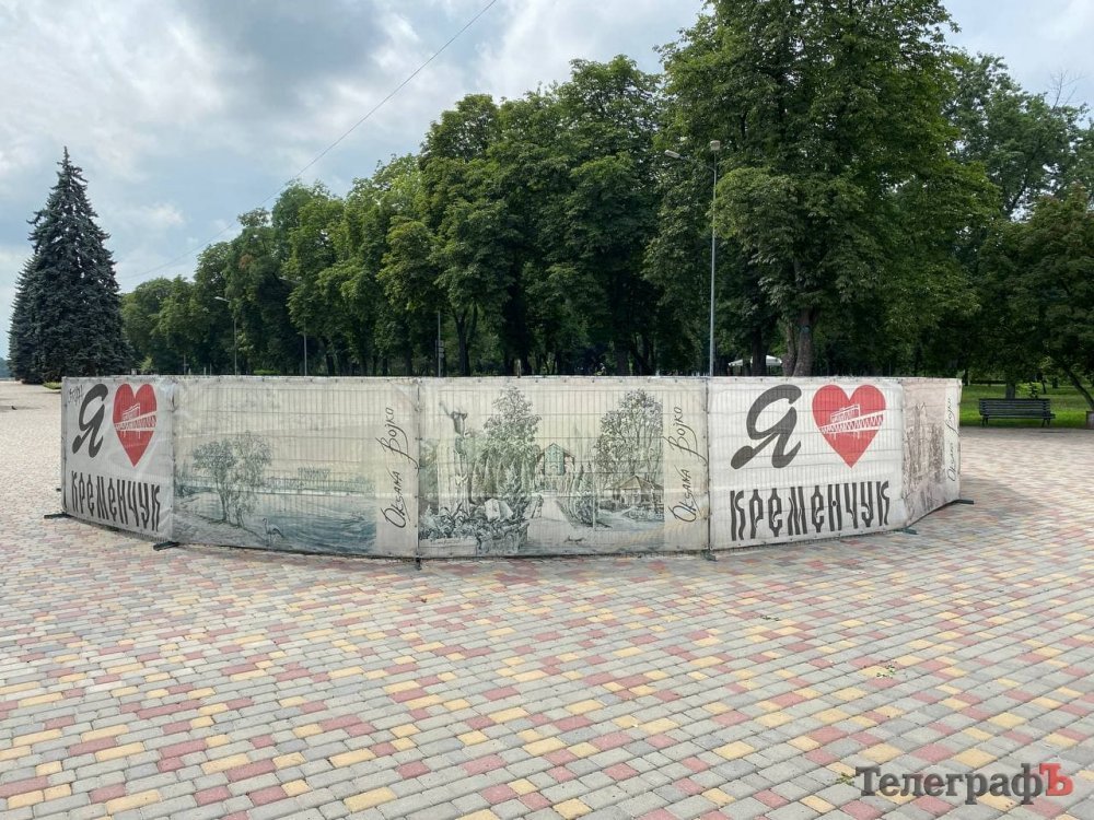 Мабуть, кожен мешканець міста одразу згадає ці об’єкти, більшість з яких закрита банерами «Я люблю Кременчук». Обабіч центральної алеї нас гостинно зустрічають два павільйони, незрозуміло для чого збудовані багато років тому. Банери з них вже прибрали – адже негода та любителі стріт-арту добряче над ними попрацювали.