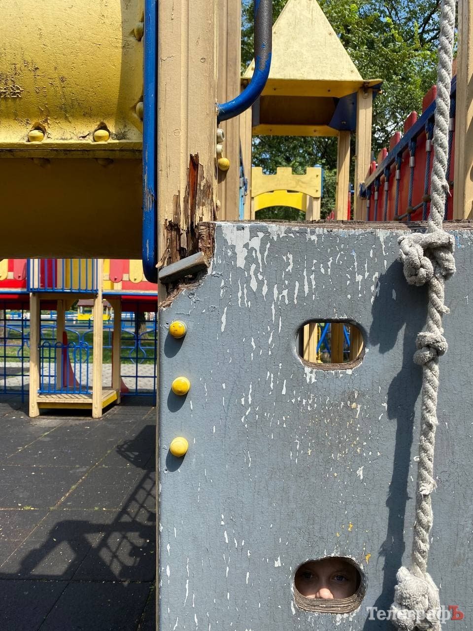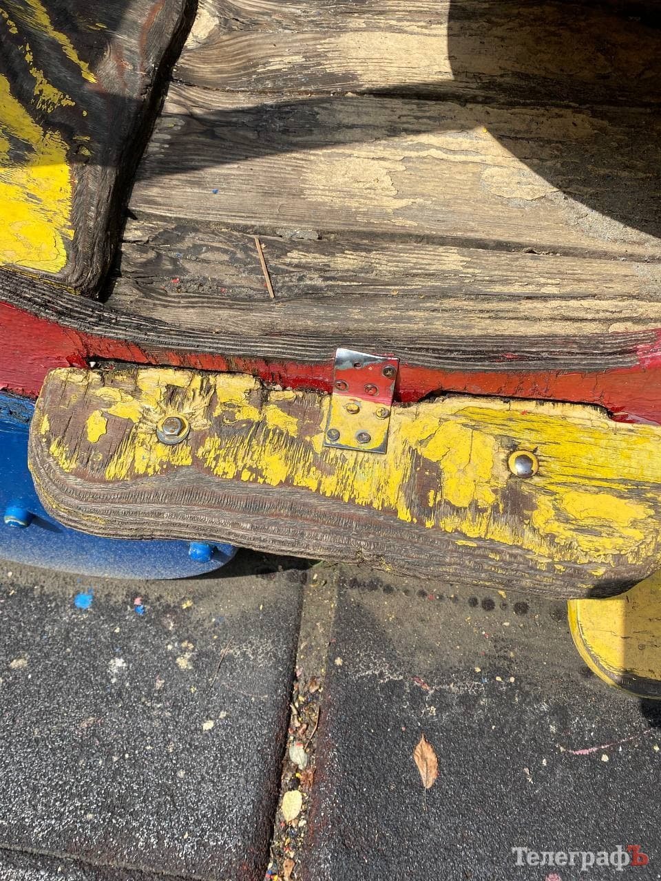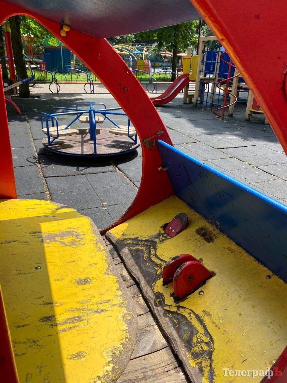 Час минав, діти виростали, приходили інші – а майданчик поступово руйнувався. Здається, окрім яскравого фарбування мало що робиться: подекуди гойдалки поламані, стирчать потенційно небезпечні цвяхи та болти, деревина розсипається. Надпис «Roshen» давно замалювали, тож ми запитали у Олександра Мірошніченко, на чиєму балансі знаходиться об’єкт та хто відповідає за його стан.