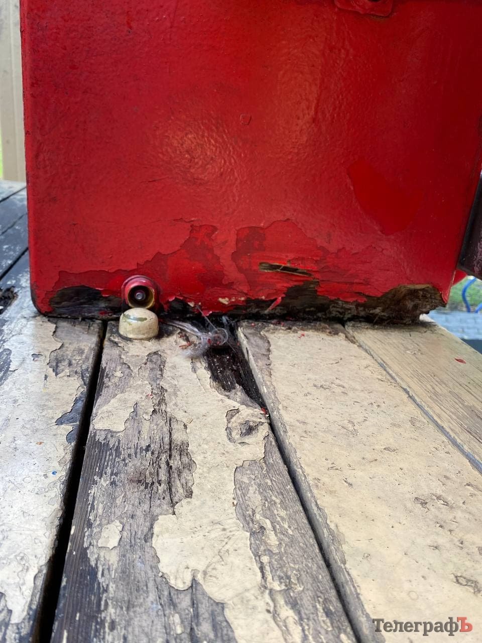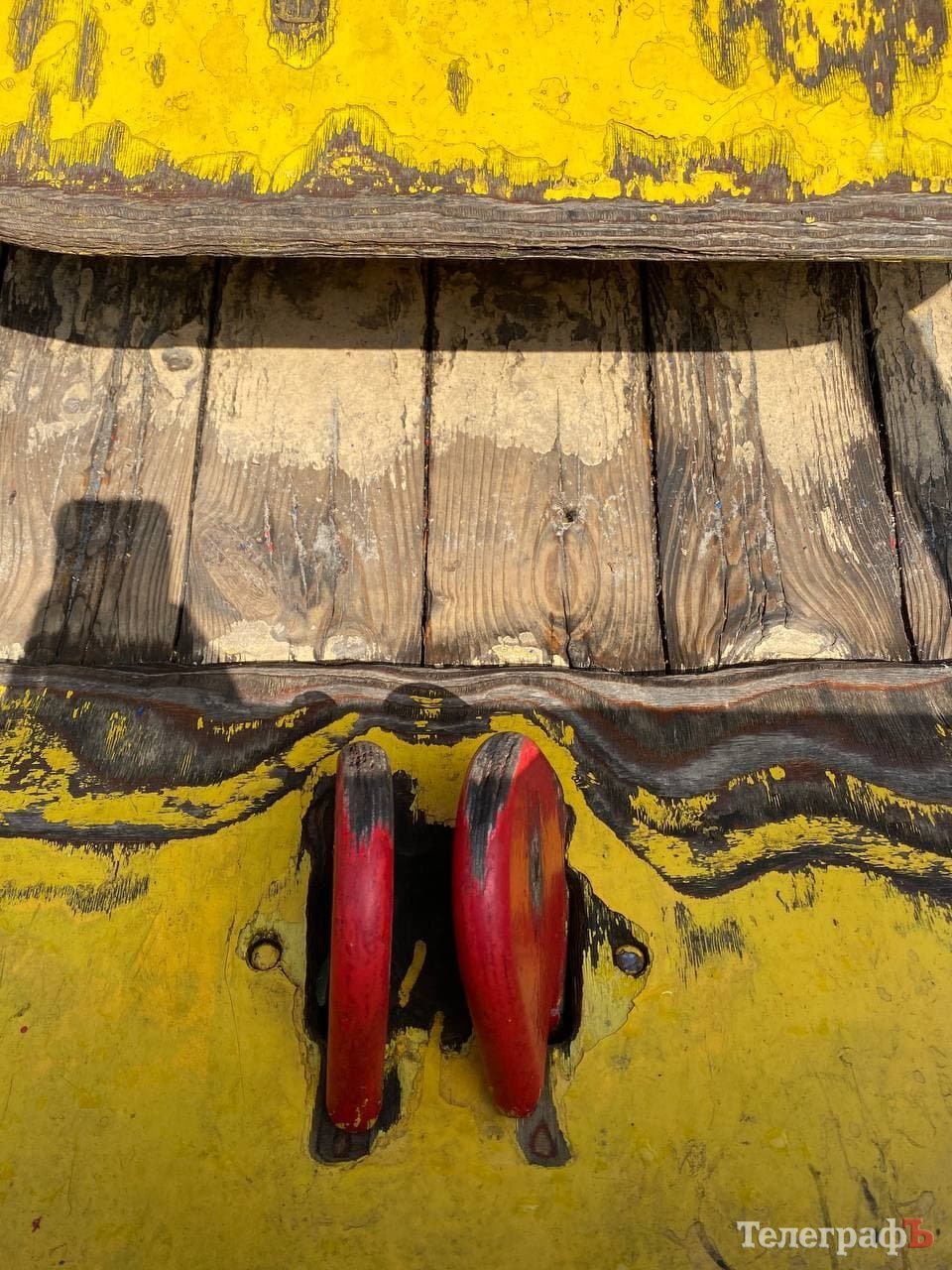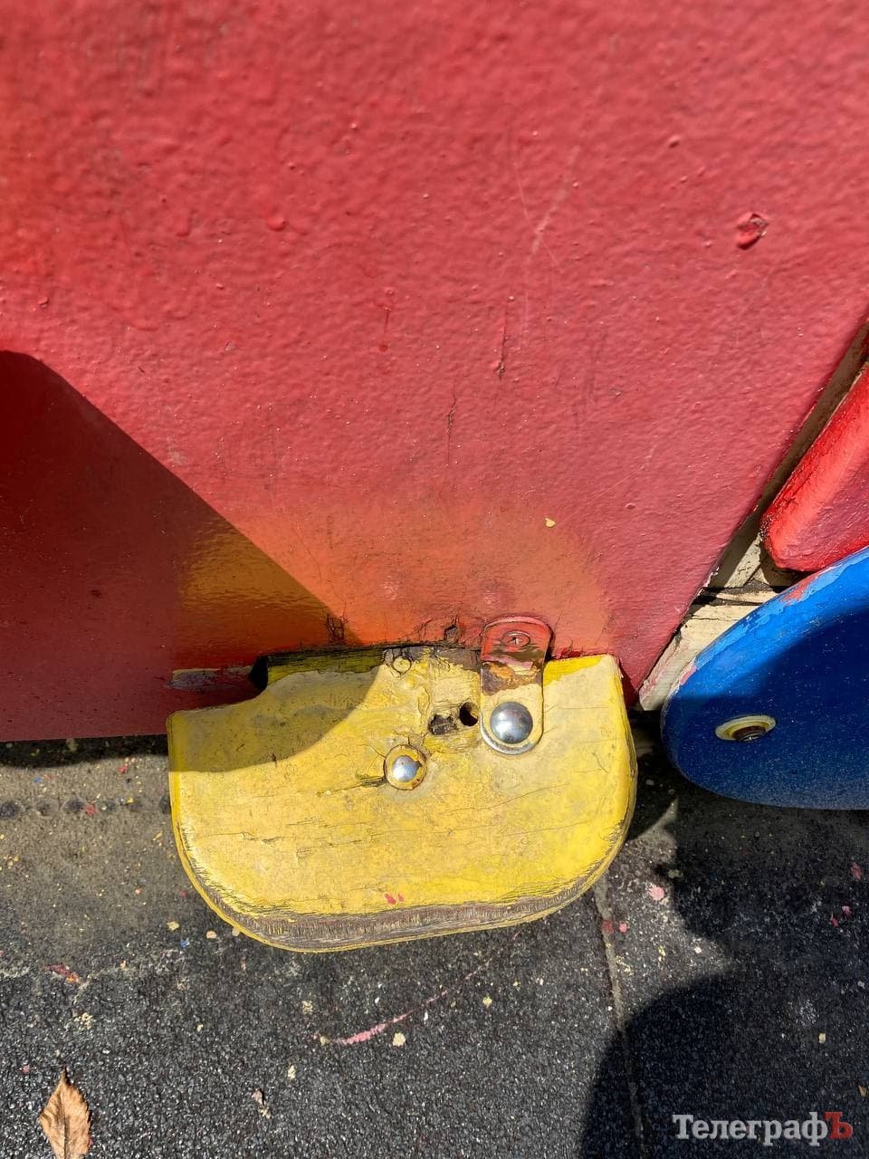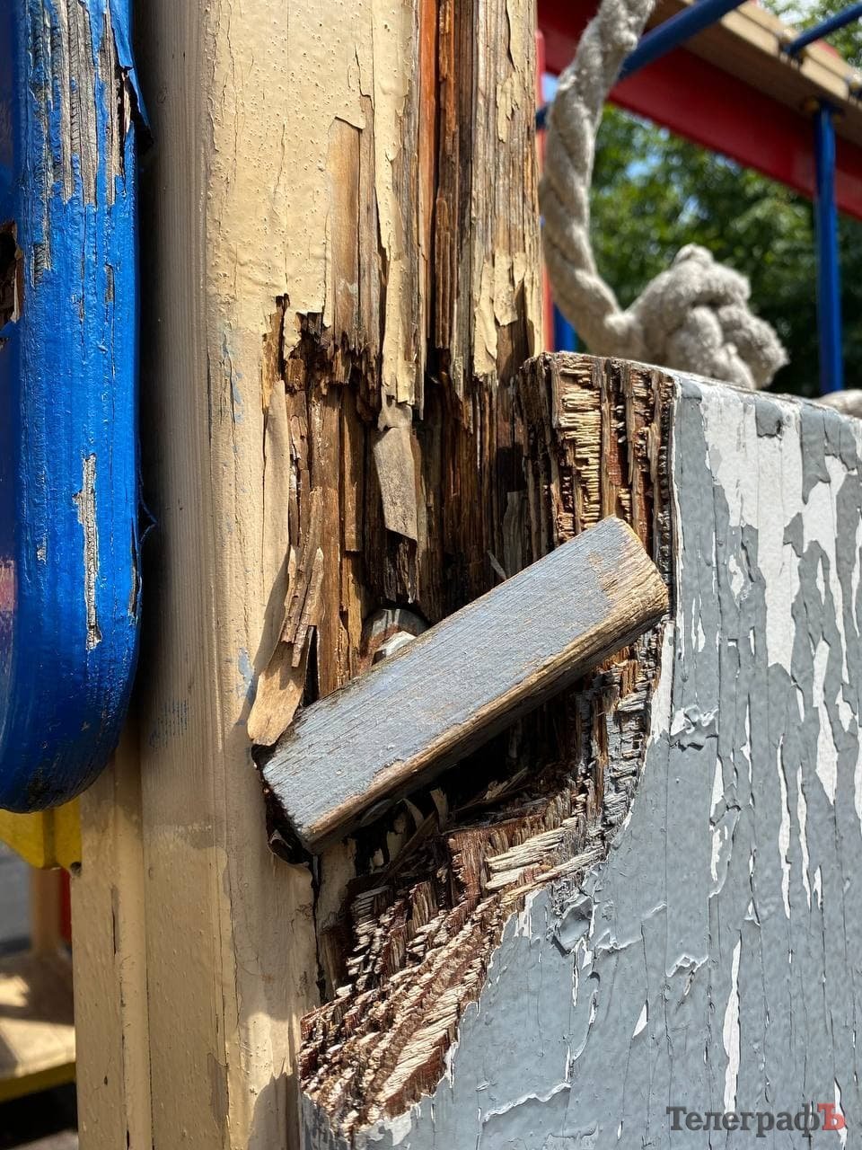 Час минав, діти виростали, приходили інші – а майданчик поступово руйнувався. Здається, окрім яскравого фарбування мало що робиться: подекуди гойдалки поламані, стирчать потенційно небезпечні цвяхи та болти, деревина розсипається. Надпис «Roshen» давно замалювали, тож ми запитали у Олександра Мірошніченко, на чиєму балансі знаходиться об’єкт та хто відповідає за його стан.