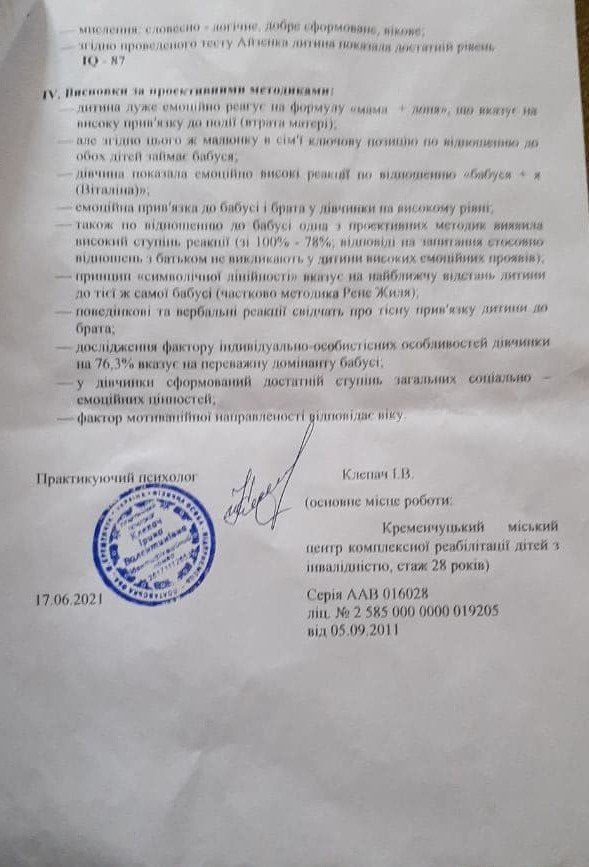 У висновках незалежного психолога зазначено, що у дівчинку на високому рівні емоційна прив’язка до бабусі та братика. Відповідь на питання стосовно відносин із батьком не викликають у неї високих емоційних проявів