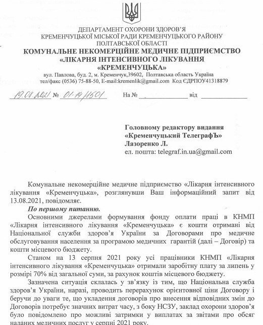 Днями у редакцію «Телеграф» звернулась читачка, яка розповіла, що в лікарні інтенсивного лікування «Кременчуцька» медперсонал потерпає від тиску з боку керівництва.