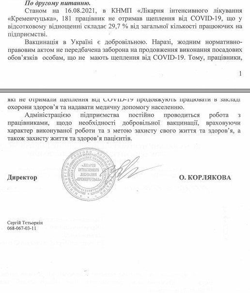 Адміністрація запевняє, що вакцинація від COVID-19 не є примусовою, і ніяких санкцій до нещеплених працівників не застосовують. Вони продовжують працювати та надавати медичну допомогу населенню.