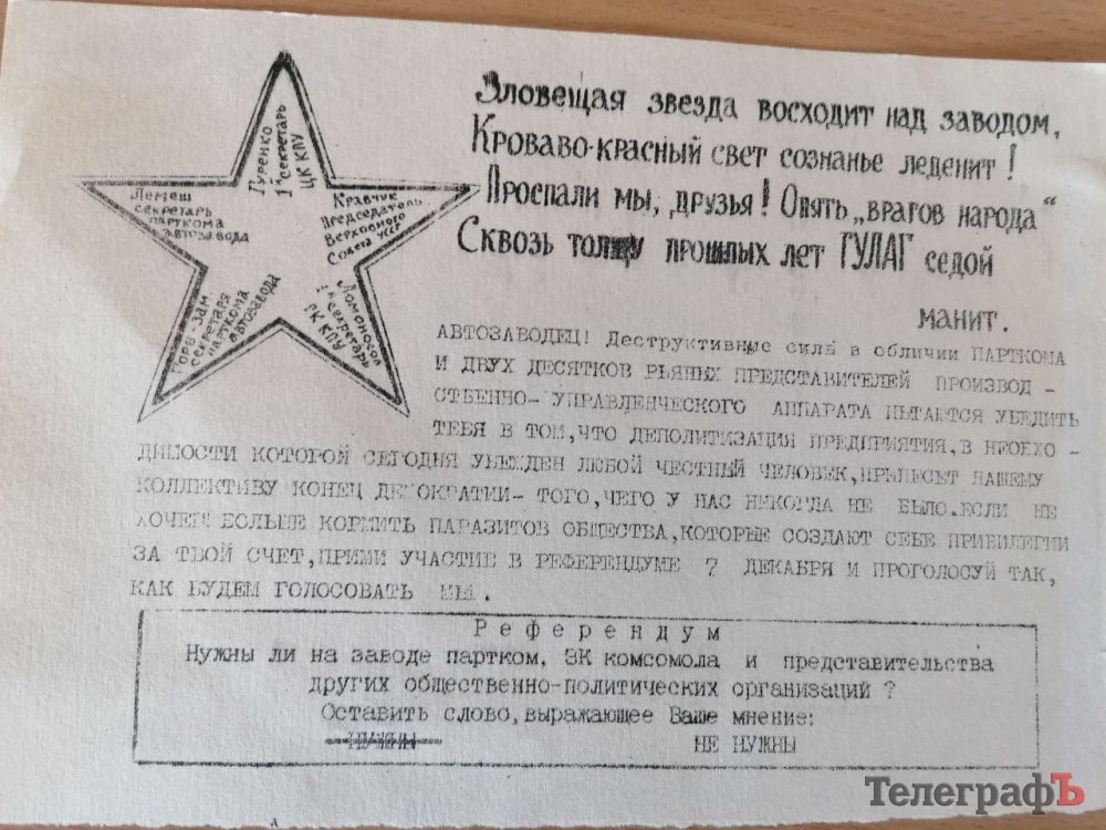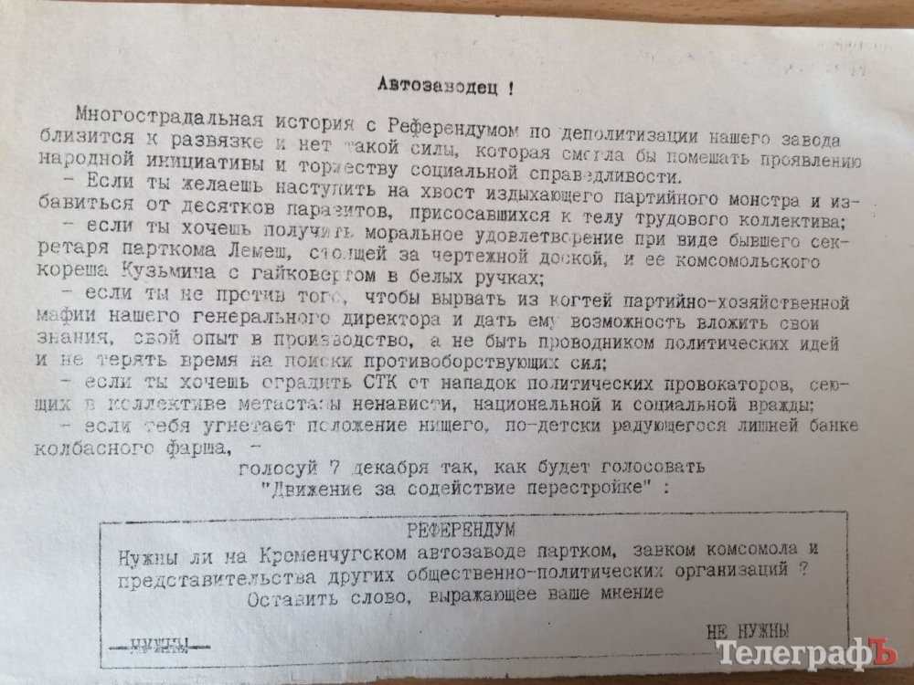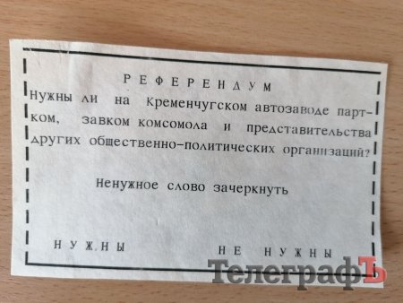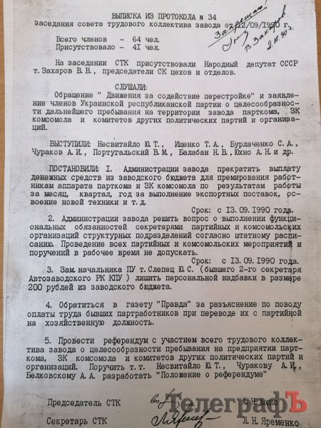 Рада трудового колективу КрАЗу постановила - провести референдум щодо доцільності парткому та політичних організацій на заводі. Віза гендиректора КрАЗу Віктора Захарова щодо референдуму: «Запрещаю!»
