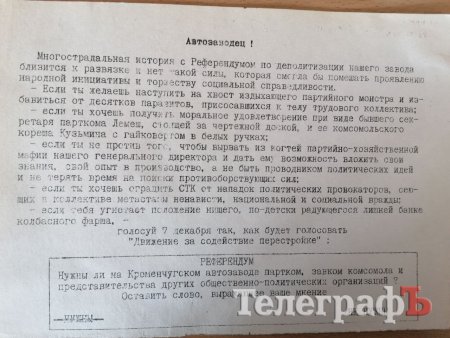 - Розумієте, почали з’являтися альтернативні думки – не ті, що нам нав’язувала комуністична пропаганда і Радянський Союз. Почалося становлення демократичних сил. І от ми доходимо до 12 вересня 1990 року. І виступаємо за те, що недоцільно на території заводу тримати партком КПРС, завком комсомолу та багато інших політичних комітетів. І ми вирішуємо провести з цього приводу референдум на автозаводі. На листі про це генеральний директор заводу пише «забороняю». Звісно, я уперся, я настирливий, і коли бачу, що правда за мною - розіб'юся, але доведу. І в нас відбувся референдум – перший на такому підприємстві у Союзі. І люди більшістю проголосували за те, що недоцільно тримати ці організації на заводі! І коли я поїхав у «білий дім» у Москву та вийшов до мікрофона та розповів, що в нас проводився такий референдум (а тоді ж мови про інші партії не було взагалі, лише КПРС). І коли почули, що абсолютна більшість автозаводців проголосувала за те, щоб ці організації залишили територію підприємства - тут овації! Оце Кременчук! Піднімається вся зала у «білому домі», хоча вони ж представники КПРС.