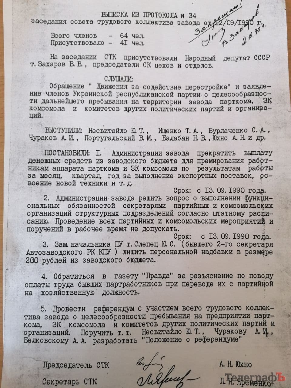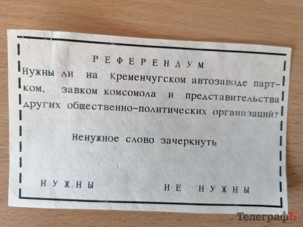 Рада трудового колективу КрАЗу постановила – провести референдум щодо доцільності парткому та політичних організацій на заводі. Віза гендиректора КрАЗу Віктора Захарова щодо референдуму: «Запрещаю!»
