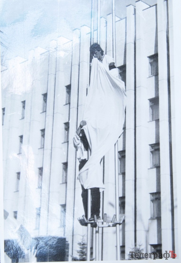 – Зараз дуже важко згадати, але мені здається, що найбільше це була ідея Тамари Просяник (вона навіть оголосила голодування, коли влада не давала підняти цей прапор) і Володимира Пилипенка – з технічної точки зору. Він пропонував: он, біля інституту, стоїть пірамідка – така, де щоглу можна прикріпити. «Я бачив, – каже, – як ті болти можна відкрутити, і ми її привеземо, щогла є» (трубу на щоглу Коля Левченко дав). Після Кременчука і в Світловодську піднімали прапор. А тризуби для щогл обох цих прапорів виготовили у нас на автозаводі, в експериментальному цеху. Я доручив зробити ці тризуби, у мене були однодумці. Георгій Мокренко виготовив ці тризуби на моє прохання. До речі, у Світловодську той тризуб був багато років – навіть у минулому році я його бачив. А зараз уже щогла нова… Пошила перший прапор працівниця автозаводу Світлана Андрусенко, вона тоді працювала інженером держприймання. Була ідейною – брала участь ще в першій ініціативній групі з екології, коли ми виступали проти БВК (у неї діти страждали від алергії). Ми товаришували – а потім уже разом готувалися, щоб підняти прапор над міськрадою. Я навіть не пам’ятаю зараз, де взяли тканину. Тоді ж дефіцит був! Але десь дістали – і Світланка ото пошила.